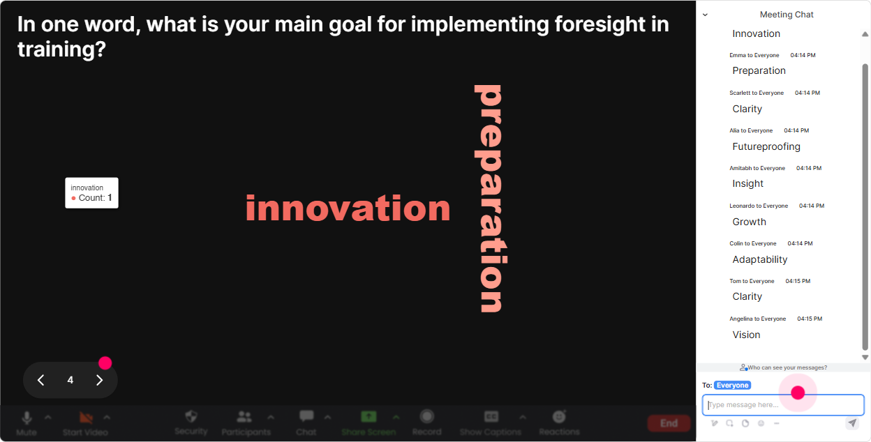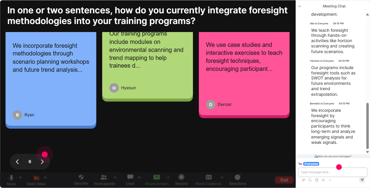 This is where you move from theory to real life. **Talking Tiles** is perfect when you want fuller answers (not just one word). People type into chat, and responses become these fun, visible tiles on screen-so it feels like the whole room is contributing. Prompts that work really well in a Foresight class: - Where would Foresight help you most in your role right now-sales, program design, facilitation, leadership conversations? - Tell me about a time you *didnt* see a change coming. What happened? - Whats one decision your agency is making this quarter that would benefit from a future lens? - If clients asked for future-ready training, what would that mean in practice? Trainer move: pick 23 tiles and connect them to your framework. This is exactly why we scan signals-so these surprises become less surprising.