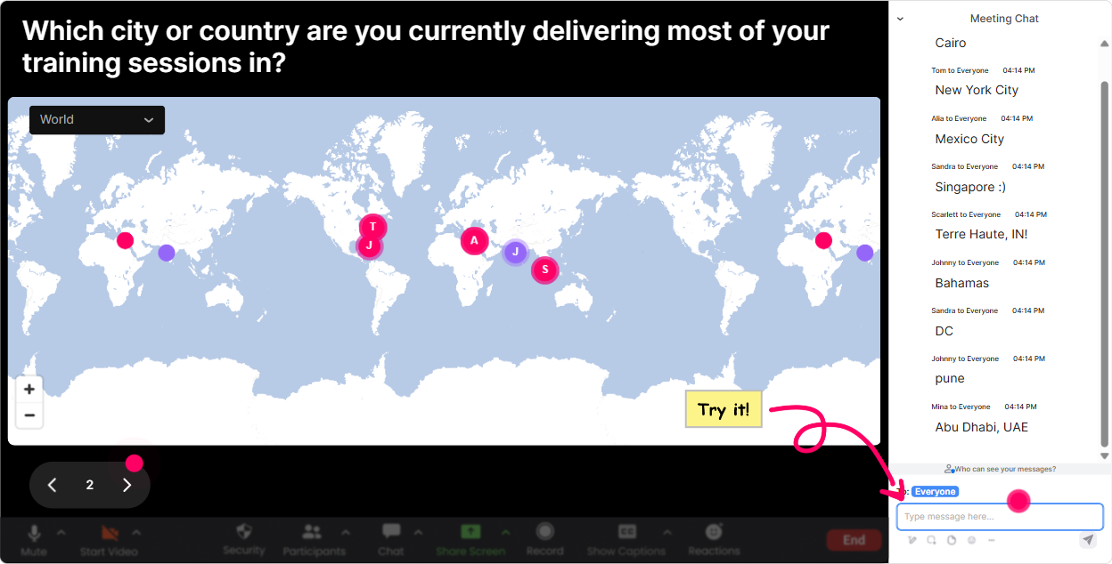 Foresight is about scanning whats happening out there, so starting with a global view just feels right. Use **Magic Maps** as your opening move: people type a location in chat, and StreamAlive plots it live. Try prompts like: - Where are you joining from today? (classic, fast, friendly) - Pick a city you think will be a *future innovation hotspot* in 10 years. - Name a place where you think disruption will hit your industry hardest. - If you could teleport to one country to study the future up close-where would you go? Trainer move: once the clusters show up, tie it straight to content: Awesome-look at how spread out we are. Foresight gets stronger when you collect signals from different regions, not just your own backyard.