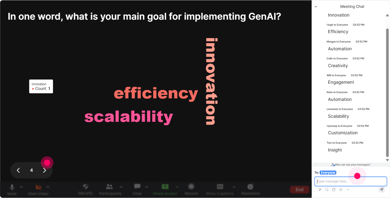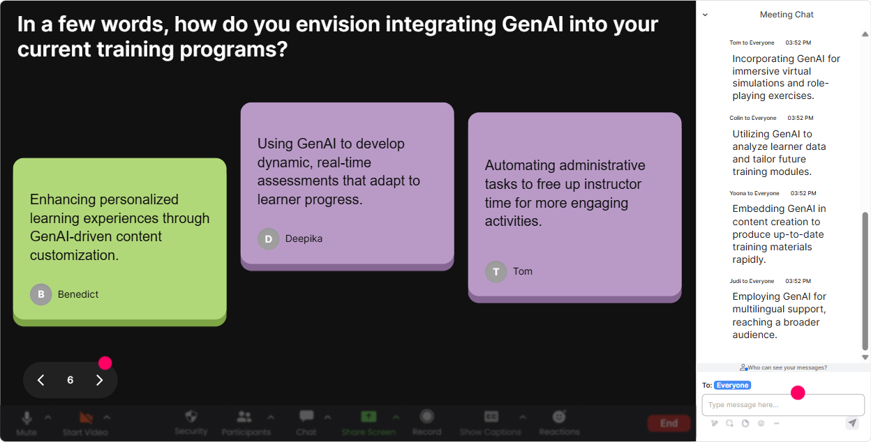 Sometimes you want more than 1-word answers-you want real examples, mini-stories, and practical use cases. Talking Tiles is perfect because it pulls those chat replies onto the screen as dynamic tiles, so people can literally see the group thinking. Use it for GenAI training scenarios like: - Whats one task in your training agency workflow youd love GenAI to speed up? - Where could GenAI help your trainers the most: design, delivery, follow-up, or evaluation-and why? - Whats a client request you get that GenAI could help you respond to faster? - Finish this sentence: GenAI would be useful for me if it could ______. Trainer tip: Read 35 tiles out loud and categorize them live (These are mostly design tasks these are client comms these are assessment-related). It feels interactive, but youre still steering the session like a pro.