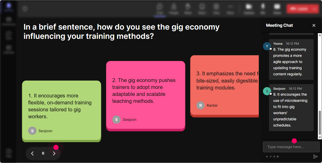 Gig economy sessions spark tons of questions-especially around policy, classification, fairness, and internal pushback. StreamAlive Q&A (Quick Questions) pulls questions from chat and organizes them so you dont lose the good ones. How to use it in a Gig Economy ILT: - Tell them upfront: Drop questions anytime-StreamAlive will catch them and Ill hit them during our Q&A blocks. - Use structured Q&A moments: - After definitions/trends: Whats unclear about gig economy terminology? - After risk/compliance: Whats your biggest what if scenario? - After implementation: Whats the hardest part of training leaders on this? Why it boosts engagement: - Participants ask more when they trust their question wont be ignored. - You can keep teaching without constantly scanning the chat. Trainer tip: - Combine Q&A with a poll: Which question should we tackle next? and let the room choose.
