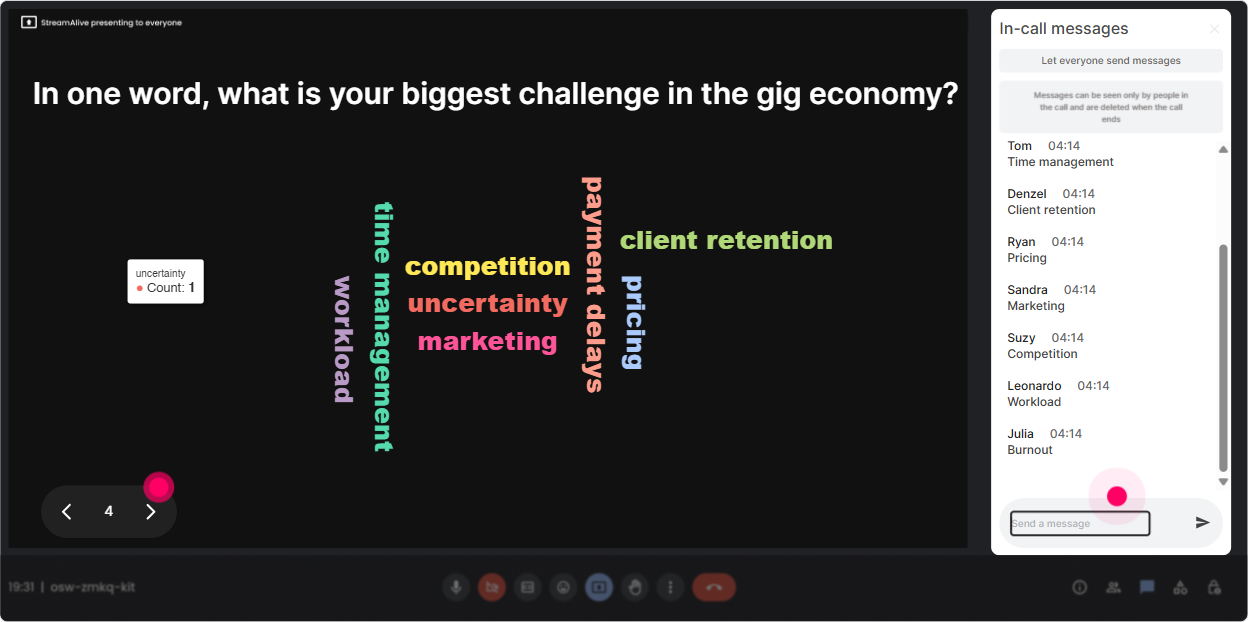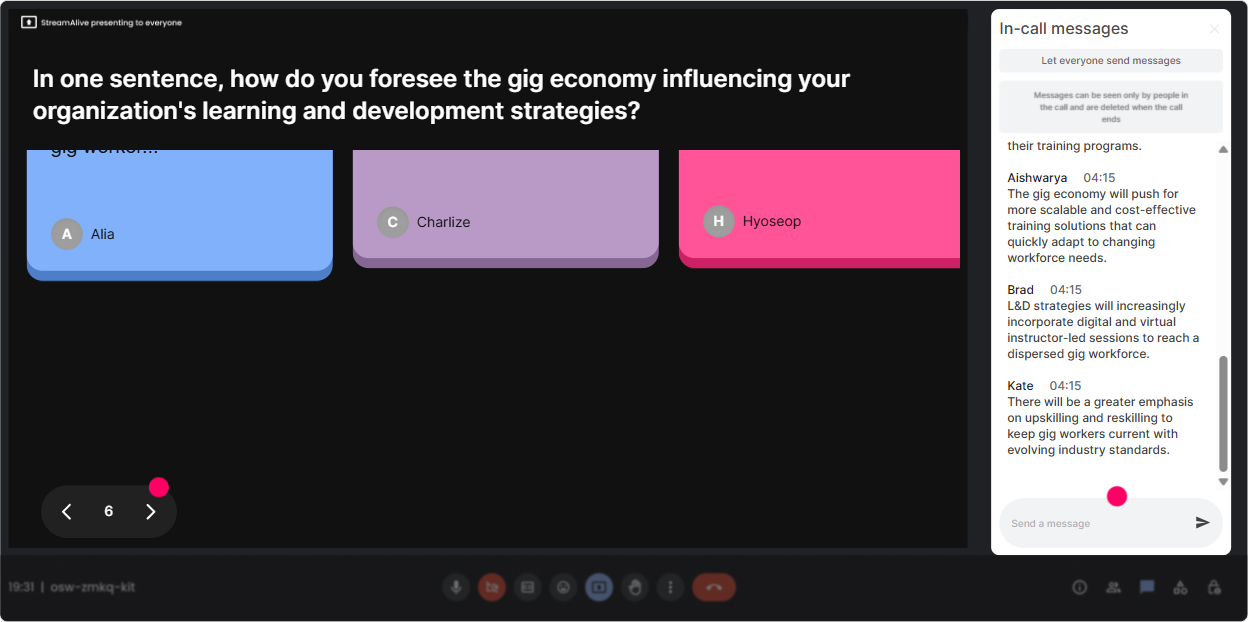 In gig economy sessions, questions come fast-legal, policy, procurement, learning design, you name it. StreamAlives Q&A pulls questions from the chat and organizes them so youre not scrolling like a maniac. How to use it smoothly: - Tell them: Drop your questions anytime-StreamAlive will catch them. - Park-and-answer style: Ill handle clarifying questions right away; deeper ones Ill answer in our Q&A block. - Prompt better questions: Ask me the thing your leadership team keeps debating about gig talent. This keeps your flow clean while still making people feel heard.
