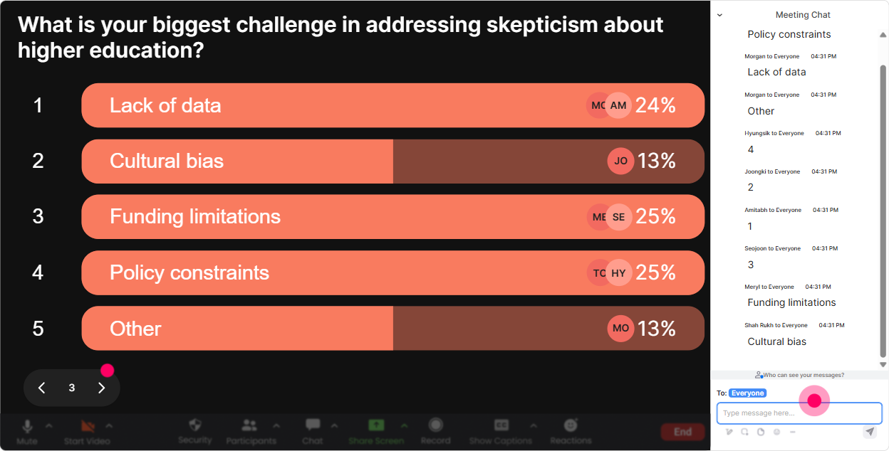 Higher-Ed Skepticism is a big umbrella. Some people need help with messaging, others with research, others with handling objections. Power Polls help you prioritize what matters to this specific room. Poll ideas you can run early: - Whats the hardest part of dealing with higher-ed skepticism? 1) Tuition/cost objections 2) ROI and employability doubts 3) Skills > degrees arguments 4) Credential alternatives (bootcamps, certs) 5) Trust issues (institutions, politics, media) - Which audience are you dealing with most? 1) Students 2) Parents 3) Corporate partners 4) Internal leadership Trainer tip: Tell them youll adapt the agenda based on results-and actually do it. That alone boosts engagement because they feel heard.