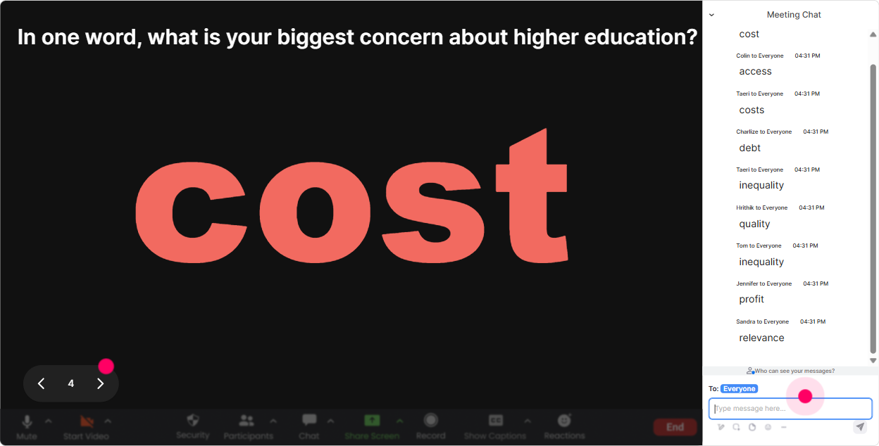 Skepticism can be a touchy topic. Some people dont want to say their real opinion out loud. A word cloud makes it safe, quick, and visual. Prompts that work really well: - When you hear higher-ed skepticism, whats the first word that comes to mind? - Whats the biggest reason people doubt higher-ed value? (12 words) - What emotion do you hear most from learners/clients? (confused, frustrated, hopeful, angry, etc.) Trainer tip: Use Combine Similar Answers so cost, expensive, and tuition dont split into tiny bubbles. Then you can say, Okay-COST is clearly the monster in the room.