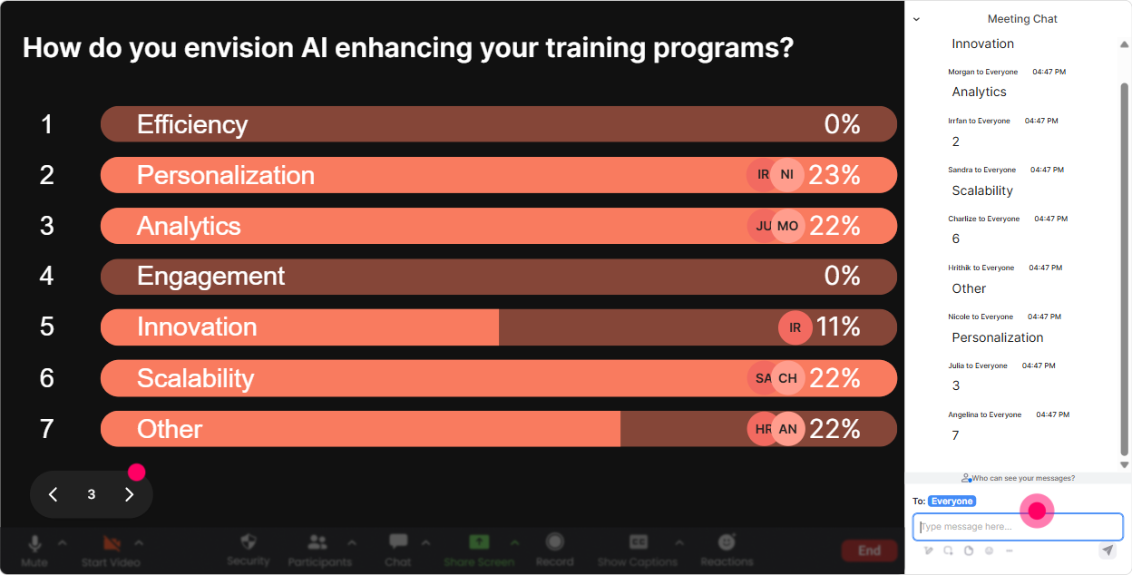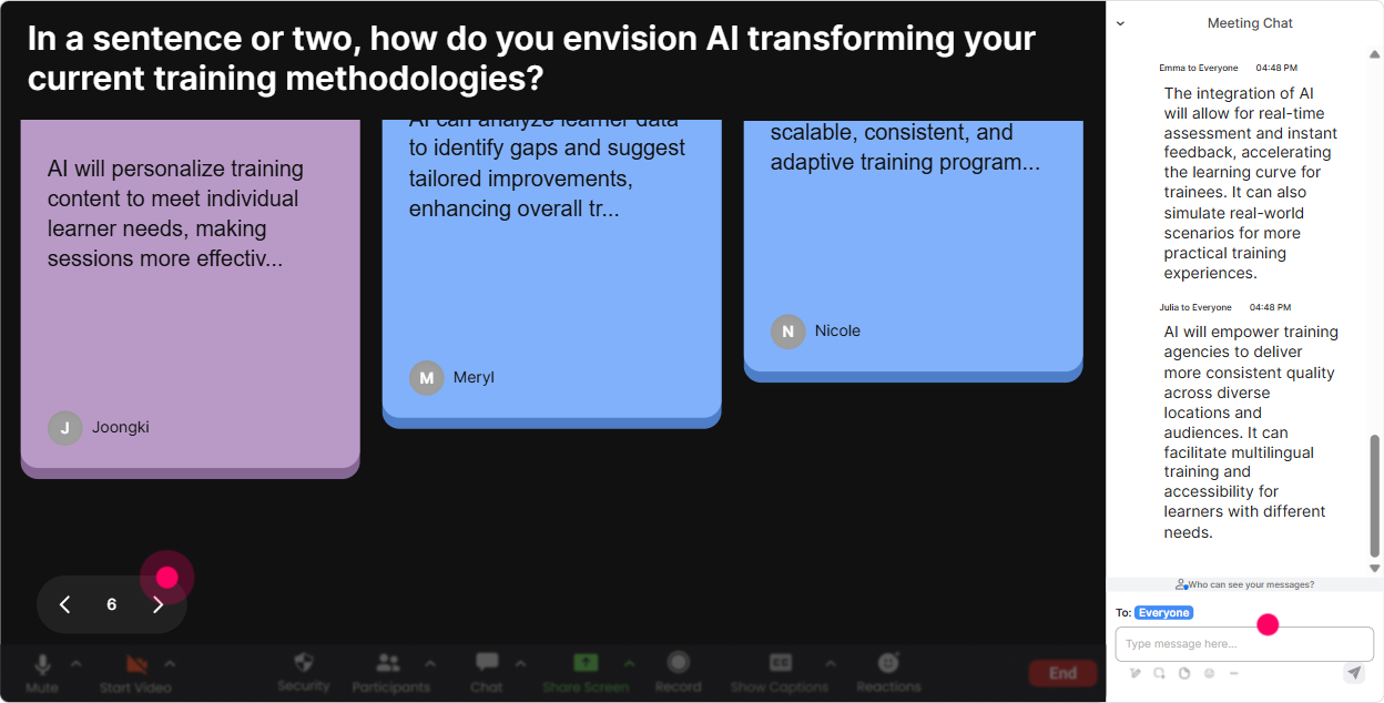 Power Polls are your choose our adventure tool. Instead of guessing what the agency audience needs, you let them vote-and then you teach what wins. Poll ideas for Human-AI Synergy training: - Which topic would help you most today? 1) Prompting basics 2) Human-in-the-loop quality control 3) Building AI into training design 4) Risk, privacy, and compliance - Where are you personally at with AI? 1) Just exploring 2) Using weekly 3) Using daily 4) Teaching others - Whats the biggest blocker in your org? 1) Policy 2) Skills 3) Buy-in 4) Tool access Trainer tip: Say this out loud before you launch it: Whatever wins, Ill adjust the next segment. People instantly feel like their chat message matters-and that keeps them participating all session long.