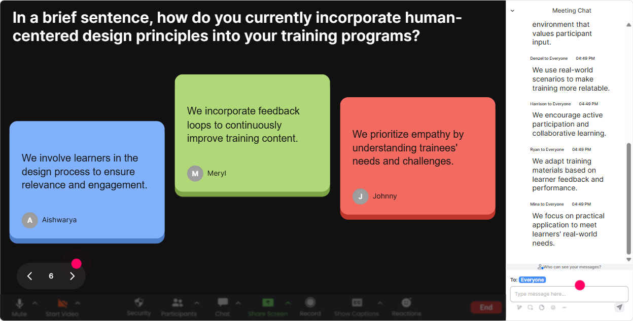 When you want more than one-word answers, Talking Tiles is gold. People type their responses in chat and you get this energetic on-screen waterfall of ideas-way more fun than Anyone want to share? Use it to pull out real-world impact: - Think of a time training felt NOT human-centered. What happened? - Whats one change youve made that improved learner experience? - If your learners could redesign your next workshop, what would they ask for? Trainer move: Pick 23 tiles and read them out like youre hosting a live show. This one says Too much theory, not enough practice-yep, thats a classic. Lets fix that with a simple redesign framework. Suddenly your content is anchored in their reality.
