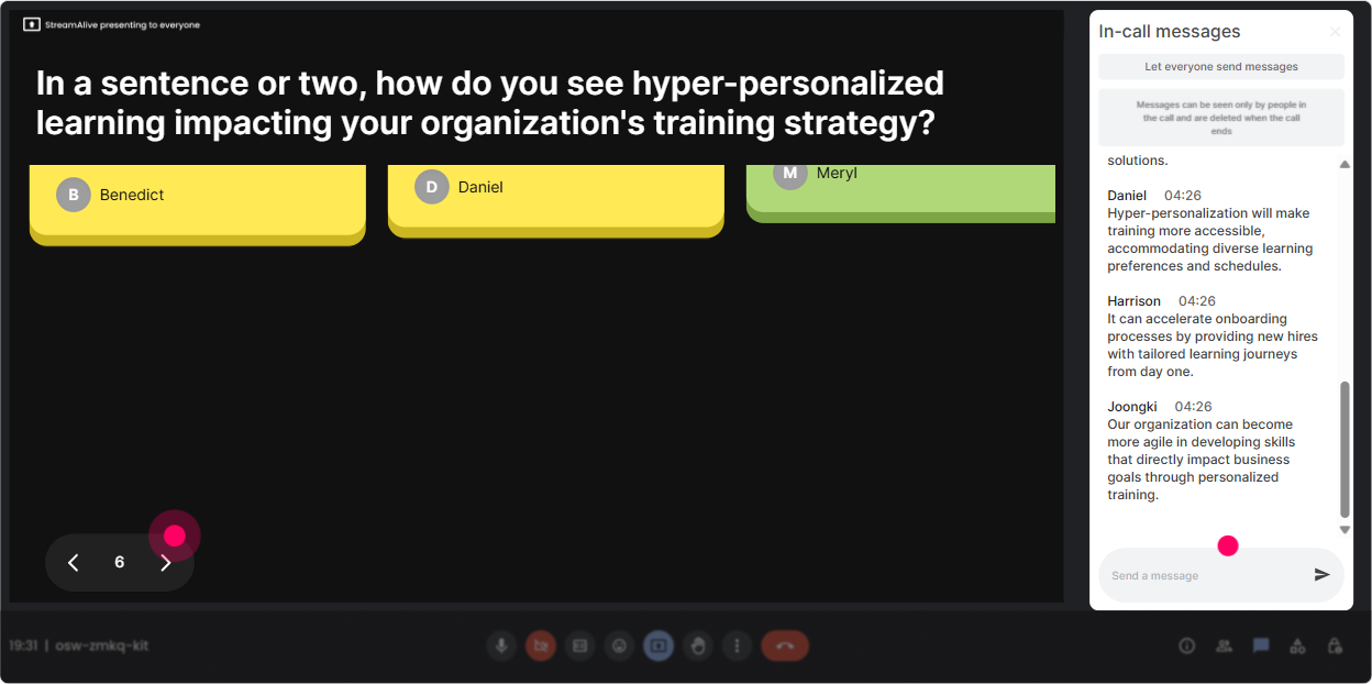 When youre teaching something strategic like hyper-personalization, questions come in fast-and they get buried in chat. StreamAlives Q&A automatically detects and collects questions so you can actually manage them like a pro. How to use it in your session: - Tell them the rule: Drop questions anytime-StreamAlive will capture them, and Ill pause every 10 minutes to answer. - Use it for topic parking: If we cant get to it live, Ill address it at the end or in a follow-up. Typical questions youll see (and should welcome): - How do we personalize when our LMS data is messy? - Whats realistic without AI? - How do you avoid creating 100 versions of everything? Trainer tip: When you answer a question, say the persons name. Tiny move, huge engagement boost.
