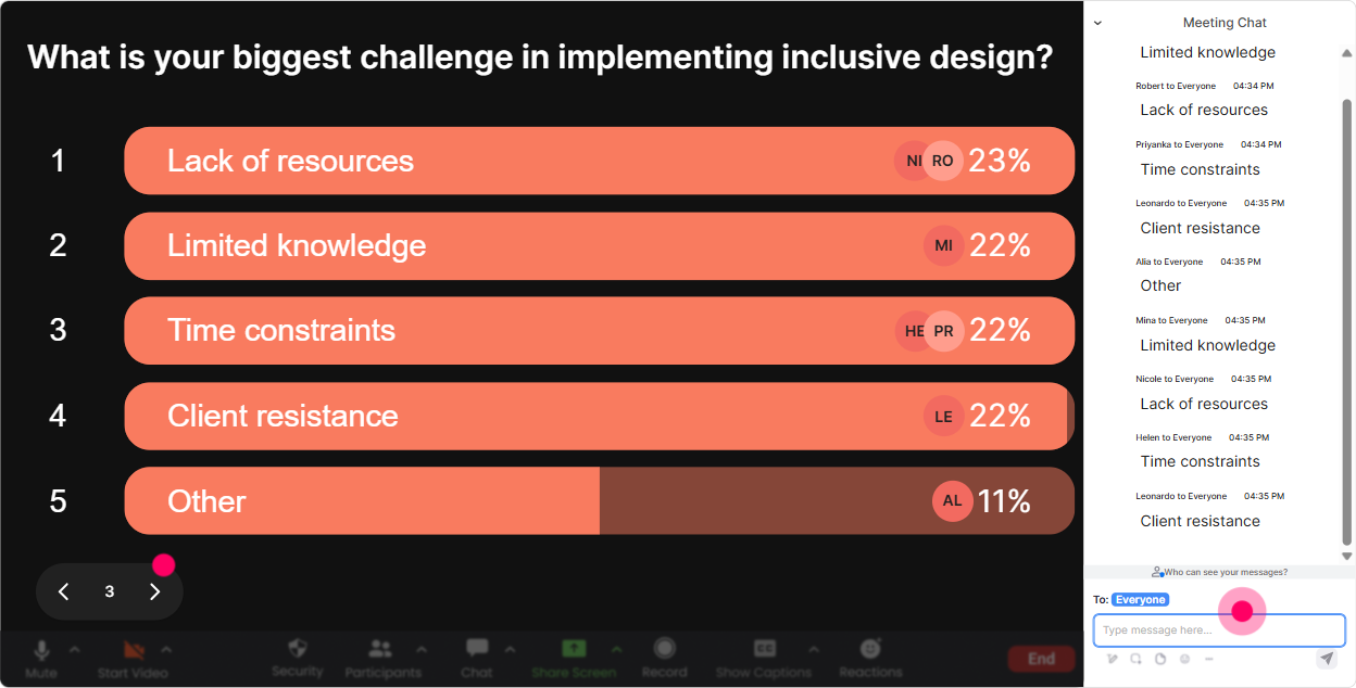 Accessibility is a big topic. If you try to cover everything evenly, you risk covering nothing well. Power Polls help you prioritize based on what your audience actually needs. How to use it: - Offer 46 options. - People vote by typing a number in chat. - Results show live so everyone knows what the group picked. Examples (choose options like these): - What do you want to focus on today? 1) Accessible slides & visuals 2) Facilitation for neurodiversity 3) Captioning, transcripts, and audio clarity 4) Activities that include introverts + multilingual learners 5) Accessibility checklists & QA - Where do you struggle most right now? 1) Color contrast 2) Alt text 3) Reading level/plain language 4) Keyboard navigation 5) Inclusive group activities Trainer tip: If your agency runs multiple cohorts, save the results and use them to tailor future sessions (and prove to stakeholders you designed based on learner needs).