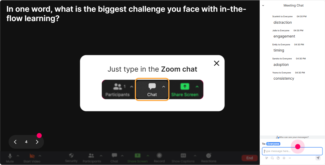 This topic is all about real work, real friction, real moments-so let people describe what actually happens on the job. Talking Tiles is great because responses can be longer, and seeing everyones messages drop in feels fun and high-energy. Prompts that work brilliantly for training agencies: - Tell me one moment in a typical workday when people NEED help immediately (not later). Whats happening? - Whats the most common I forgot how to do this task your learners face? - Where does learning currently break down-handoffs, customer calls, systems, compliance, leadership? - Describe a client scenario where flow-of-work learning would save time or reduce errors. Trainer move: pick 23 tiles and label them live: - This is a performance support moment. - This is a workflow integration moment. - This is a manager-as-coach moment. Now youre teaching the framework using THEIR words-not a slide definition.