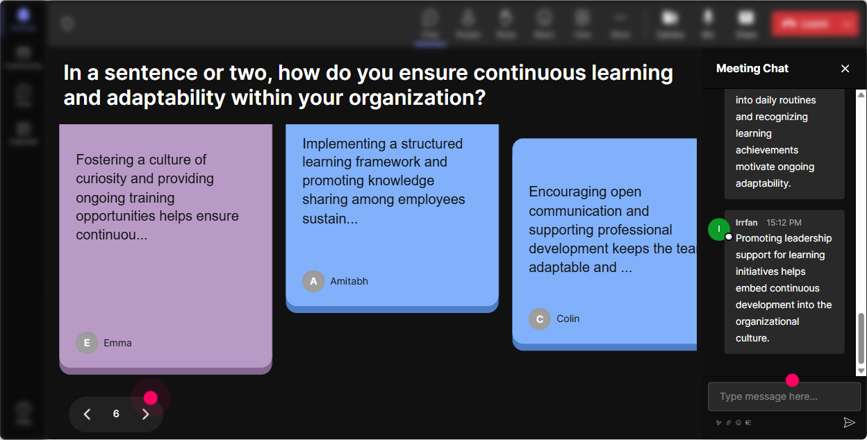 Before you teach anything, find out where people actually are. Rating Polls let everyone drop a number right in chat, and you instantly see the spread and average. Use it like a trainers temperature check: - On a scale of 110, how confident are you explaining what a Learning Organization is? - Rate your current org: how strong is the learning culture today? (1 = weak, 10 = strong) - How ready is your leadership to support learning behaviors? (110) What this unlocks: You can adapt on the fly. If the average confidence is a 3, you slow down and define terms. If its an 8, you move faster and go deeper into application.