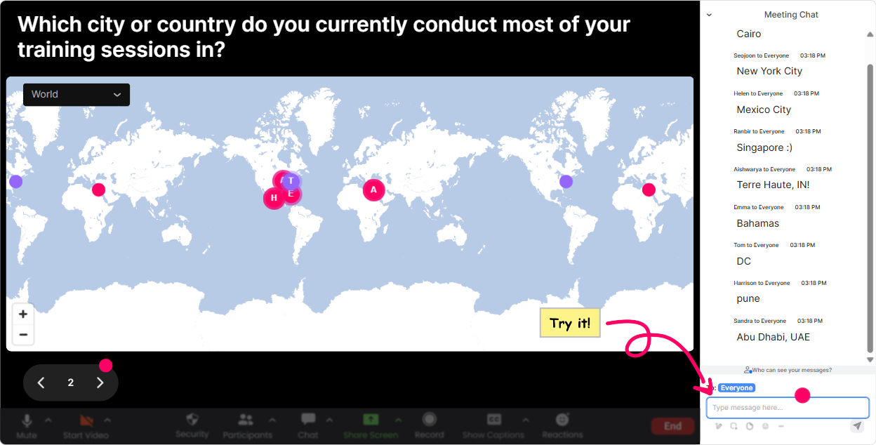The easiest way to get people typing early is the classic Where are you joining from?-but Magic Maps makes it way more fun because answers show up live on a real world map. How to use it in Lifelong Learning training: - Icebreaker: Where in the world are you joining from today? (Great for creating instant connection.) - Lifelong Learning twist: Name a city youd travel to just to learn something new (food, art, language, leadership). - Career context: Which location taught you the most in your career so far? Trainer move: when you see clusters on the map, call them out-Looks like weve got a Toronto crew! That tiny moment makes people feel seen, and chat stays active from the start.