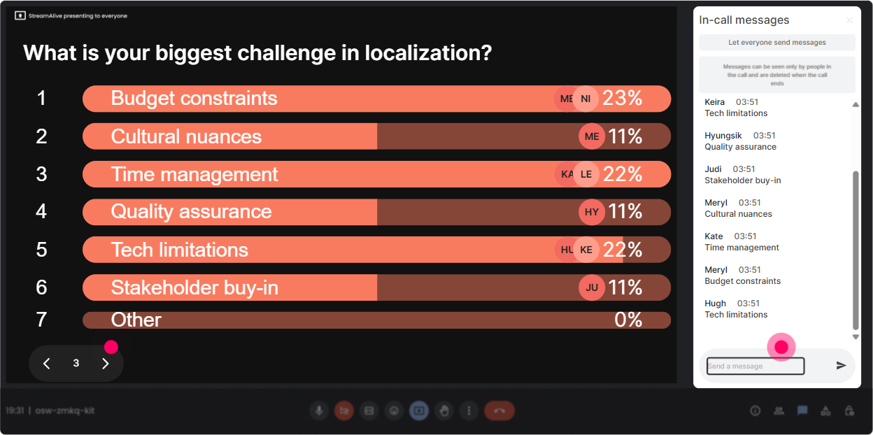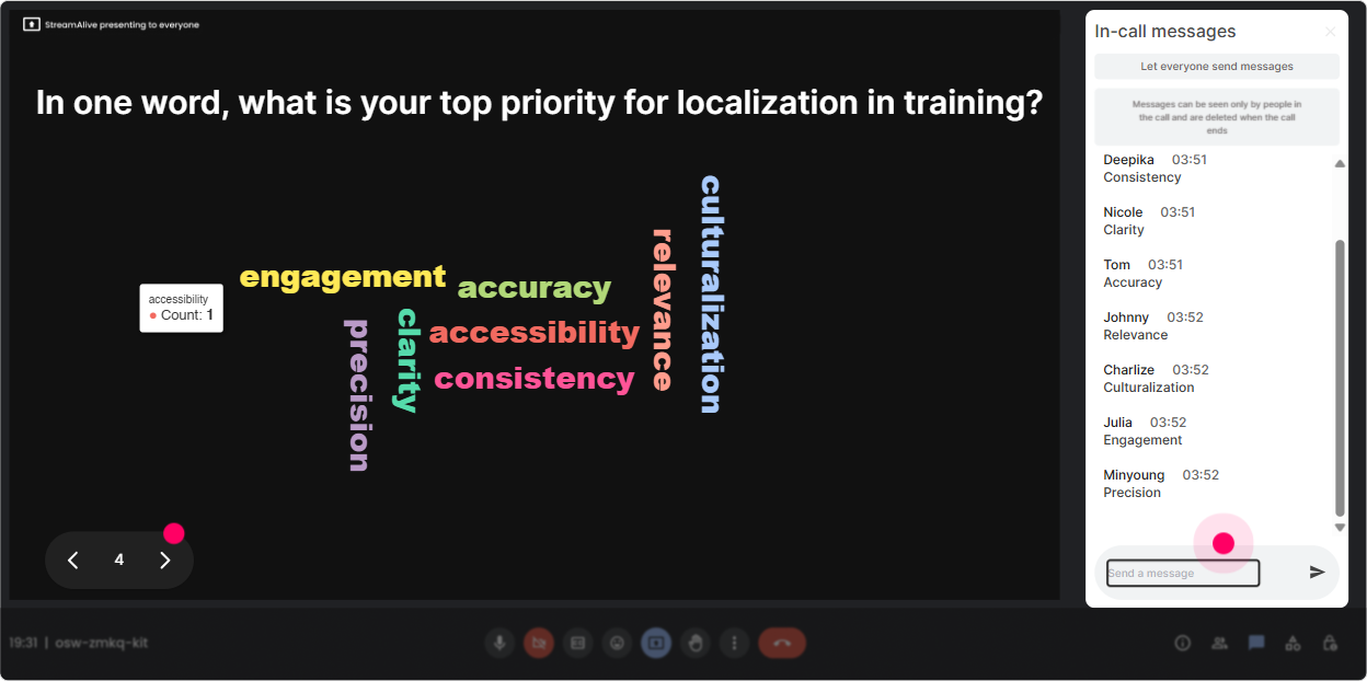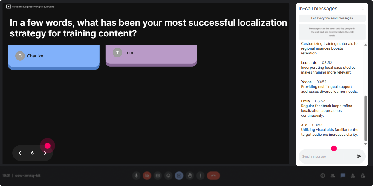 Localization sessions trigger lots of Wait, but what about? questions-vendors, approvals, legal constraints, dialect choices, SME reviews. If you rely on scrolling chat, youll miss the best ones. How to use it in your session: - Tell people: Drop your questions anytime in chat-StreamAlive will collect them for me. - Midway pause: Lets do a 3-minute Q&A sweep. Pull up the captured questions and answer the most common themes. - End-of-session: Im going to stay until we clear the list. This feels satisfying and professional. Trainer tip: It also helps quieter participants-because they dont have to interrupt verbally to be heard.