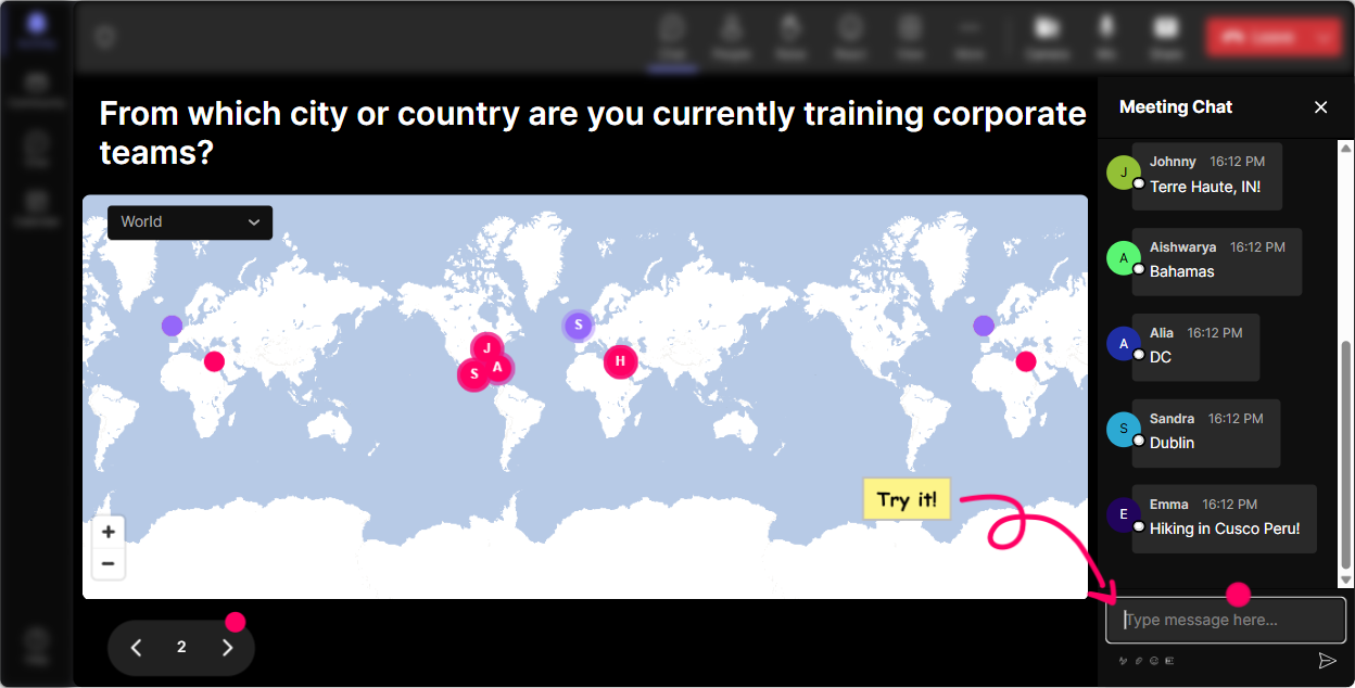 Metaverse training is all about presence-so start by creating it. Instead of the usual Where are you joining from? question that dies in the chat, Magic Maps turns it into an instant visual moment. Try prompts like: - Where in the world are you joining from today? (type your city) - If you could teleport anywhere on Earth right now, where would you go? (great segue into teleporting and virtual presence) - Name a city that represents the future of work to you. Trainer move: after the map fills up, call out clusters (Wow, weve got a whole mini-hub in Singapore!) and use that as a bridge into how Metaverse learning creates shared spaces even when people are distributed. Its a simple opener, but it instantly makes the room feel like a room.
