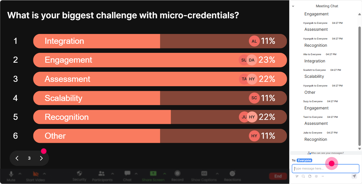In Micro-Credentials training, different people care about different things-some want standards and frameworks, some want sales positioning, some want assessment and QA. Power Polls help you stop guessing. Run a poll early with options like: Question: What do you most want to get out of todays Micro-Credentials session? Options: 1) Designing a Micro-Credential (structure + outcomes) 2) Assessment and evidence (what counts) 3) Platform + issuance (badges, verification, portability) 4) Selling Micro-Credentials to corporate clients 5) Quality assurance + governance You can also use a poll mid-session: - Which pilot model should we explore first? (single skill / role-based pathway / compliance / leadership) Trainer tip: After the poll, say: Alright, the room has spoken-well spend extra time on option #2. People engage more when they feel they influenced the agenda.