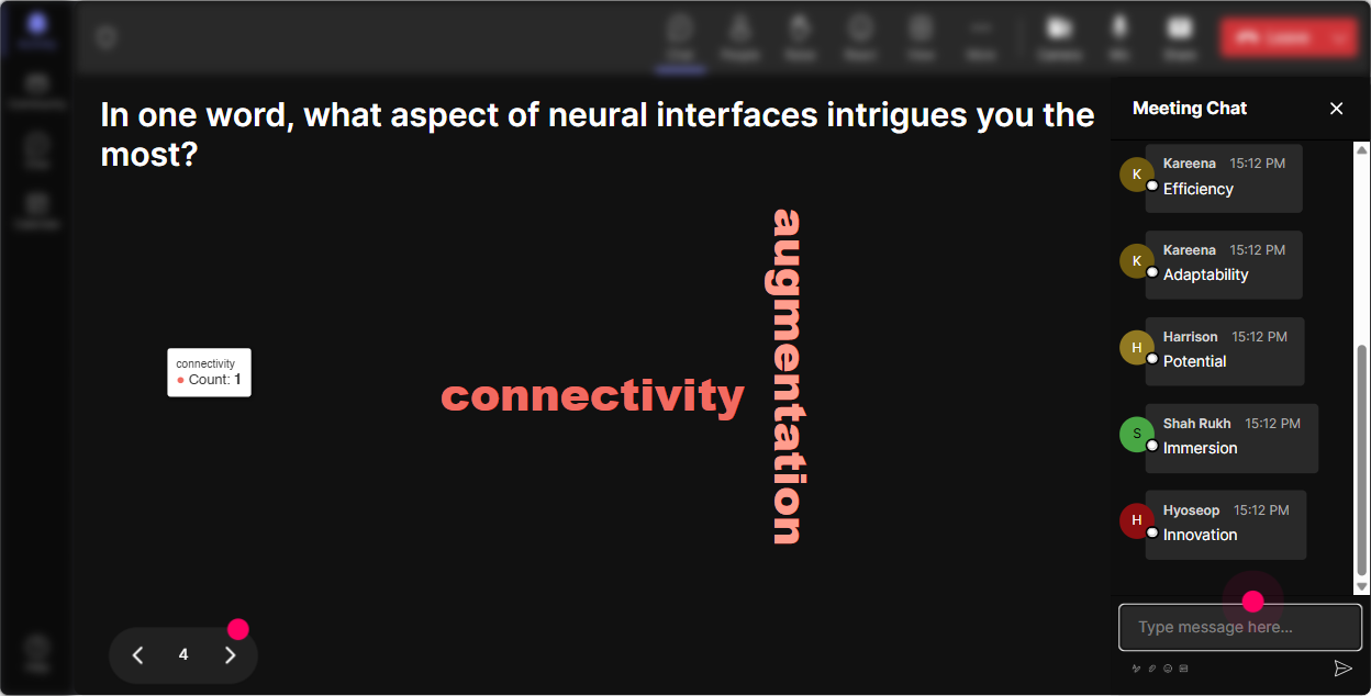 This is your read the room moment-but visual and fun. Ask for 12 word reactions and let Wonder Words display it live. Great prompts for this topic: - Neural Interface Learning in one word: what comes to mind? - Whats your biggest concern? (12 words) (Expect: privacy, ethics, bias, cost) - Whats the biggest opportunity? (12 words) (Expect: personalization, accessibility, speed) - What should this session NOT become? (12 words) (Great for surfacing hype, fearmongering, salesy) Why it works: - Even quiet folks will type one word. - The biggest words show you whats emotionally loud in the room-excitement, skepticism, anxiety-so you can address it early. Quick facilitation tip: - Use Combine Similar Answers so privacy and data privacy dont split your signal.