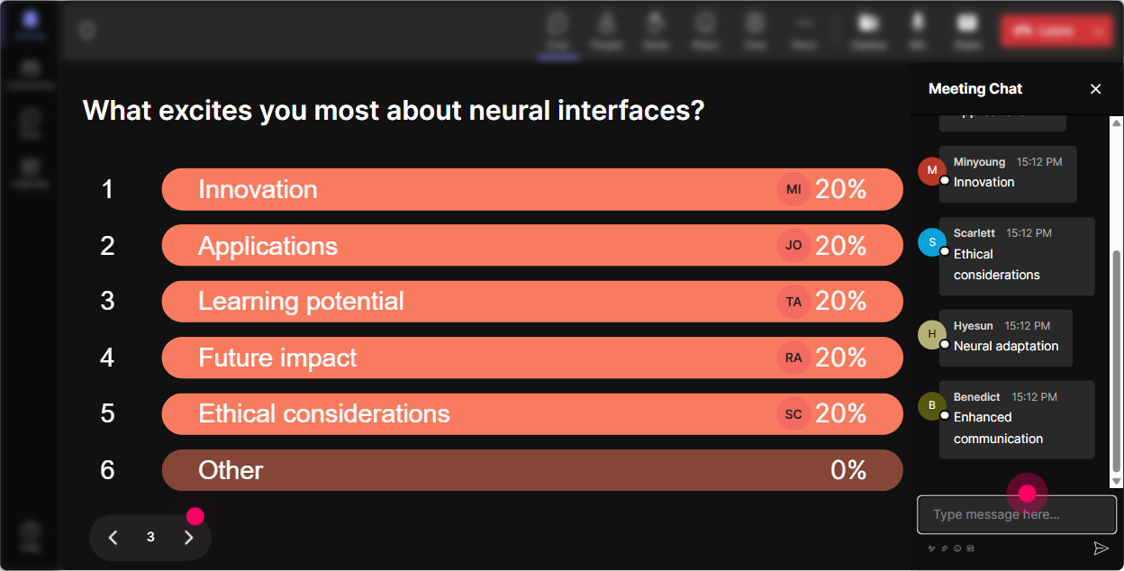 This is how you avoid the classic problem: you planned the session for Topic A, but your trainers actually need Topic C. Power Polls lets them steer-while you stay in control. Poll ideas that fit Neural Interface Learning: - What do you want most from today? 1) Practical use cases for L&D 2) How it works (simple explanation) 3) Ethics + privacy 4) How to talk about it with leadership - Where would this impact your learners most? 1) Attention/focus support 2) Faster skill acquisition 3) Accessibility accommodations 4) Real-time coaching feedback - Which risk needs the most discussion? 1) Data privacy 2) Bias 3) Consent 4) Over-reliance on tech How to run it smoothly: - Add options so people only type 1/2/3/4. - Show results live and say: Cool-looks like Ethics is the winner. Lets go there first. Engagement bonus: - People pay more attention to the section they voted into existence.