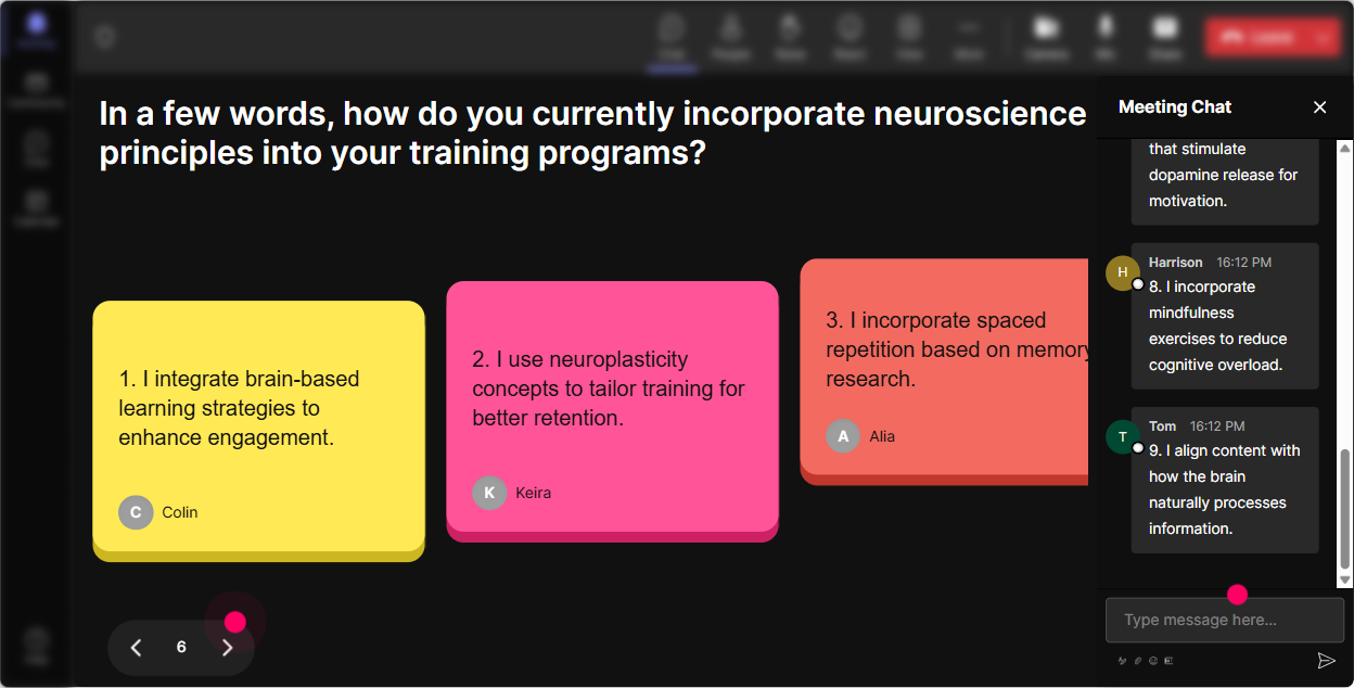 When you want more than one-word answers-like real examples, struggles, and stories-use **Talking Tiles**. As people respond in chat, their messages show up as dynamic tiles on screen. Its like your audience is building the session with you. **How to use it in Neuroscience training:** - Whats a moment in training where you can *see* learners mentally check out? - Describe a time you changed an activity mid-session to get attention back-what did you do? - Where does cognitive overload show up in your trainings (slides, activities, instructions, timing)? - Whats one brain-friendly change you want to make to your next session? **Why this hits:** Trainers learn best from other trainers. Talking Tiles lets you surface patterns fast-then you can label them with neuroscience (attention limits, working memory load, stress response, etc.).
