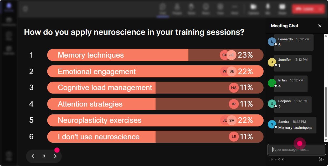 You know that moment when youre thinking, I could go deep on dopamine, or memory, or attention? Dont guess. Use **Power Polls** to let the audience vote in chat and show the results live. **Poll ideas for Neuroscience ILT (for trainers):** - Which topic would help your next training session most? 1) Attention & distraction 2) Memory & retention 3) Motivation & behavior change 4) Cognitive load & simplicity - Biggest challenge you face with learners? 1) Low participation 2) Multitasking 3) Forgetting content after the session 4) Lack of buy-in **How this boosts engagement:** People pay more attention when they feel ownership. Plus, it gives you a clean transition: Alright, you picked memory-lets build a brain-friendly retention plan.