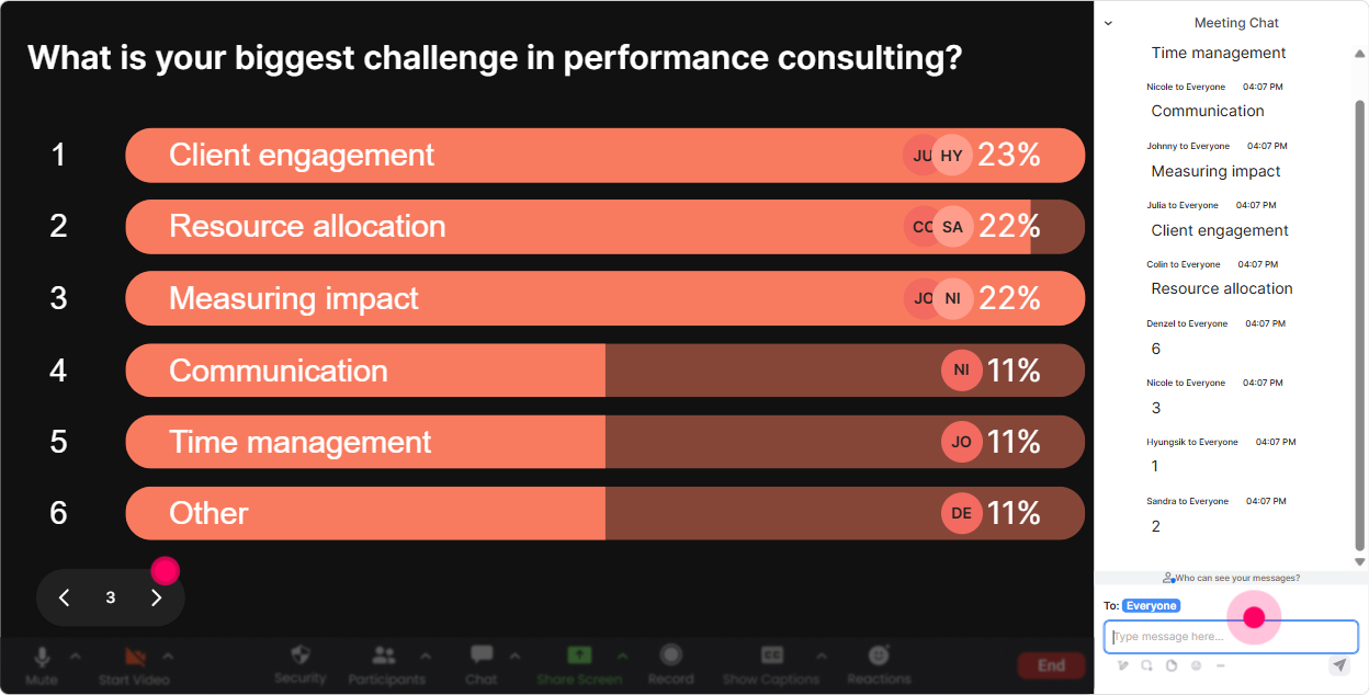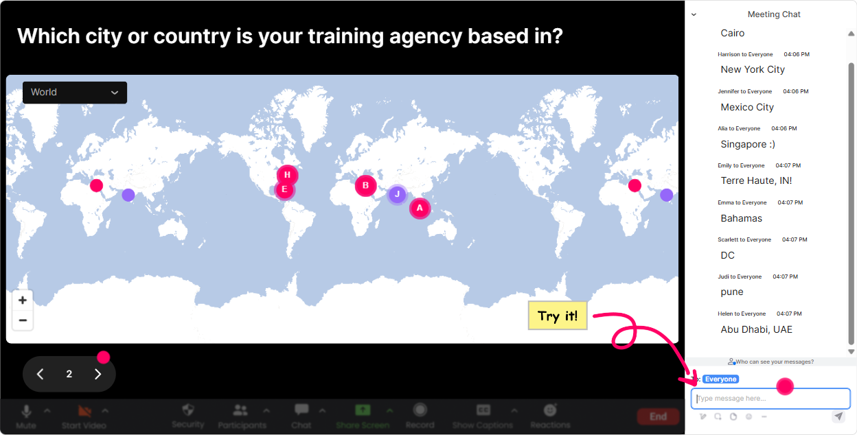 This is the easiest everyone participates moment youll get all session. Instead of asking Where are you joining from? and getting a messy chat, use Magic Maps and watch the locations pop up live on a world map. How to use it in Performance Consulting ILT: - Kickoff icebreaker: Where are you joining us from today (city + country)? Then tie it back: Awesome-Performance Consulting looks different depending on region, industry, and client maturity. Lets compare notes today. - Context-builder: Type the city where most of your clients are based. Great segue into discussing stakeholder environments and business constraints. - Needs-based angle: Drop a dream client location youd love to consult in. Fun, light, and it opens a conversation about market segments. Trainer tip: If your session has multiple groups (sales vs. delivery, new vs. experienced consultants), reset the map and run it again for each group so it stays relevant.
