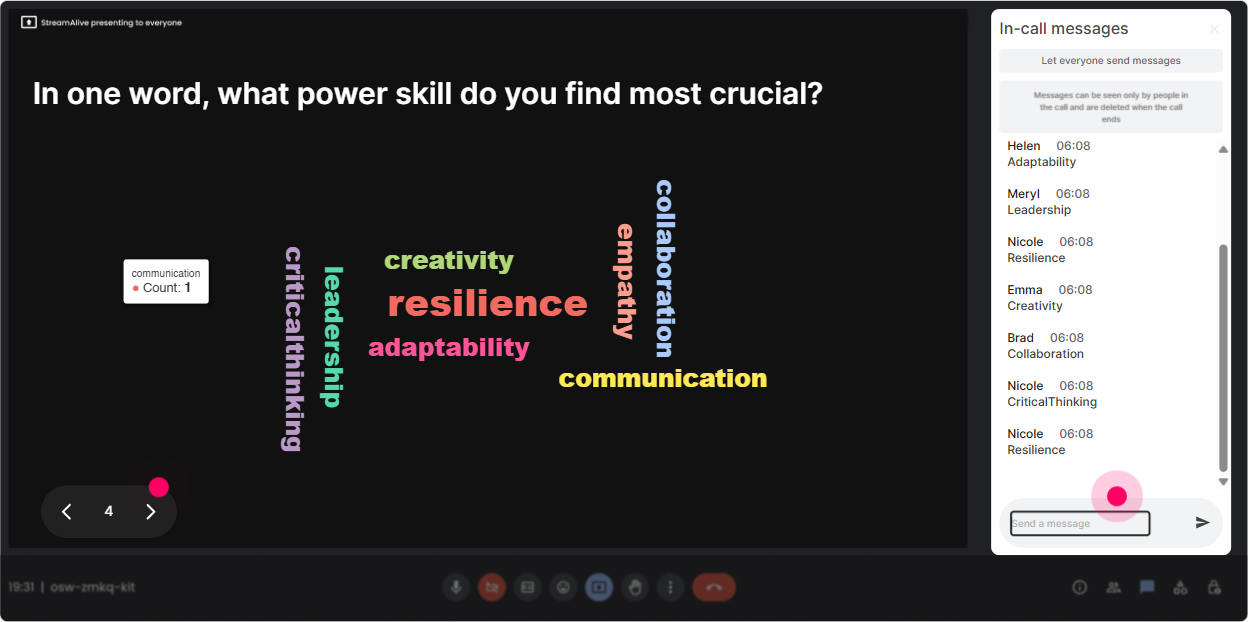 When you want longer, richer responses-use Talking Tiles. People type full thoughts, and StreamAlive turns them into a dynamic visual on-screen. It feels like the session is being co-created live (because it is). Great prompts for Power Skills Focus ILT: - What power skill makes the biggest difference in your L&D role-and why? - Share a moment where a leaders lack of power skills created a real business issue (no names). What happened? - If you could improve ONE behavior in frontline leaders this quarter, what would it be? Trainer tip: Grab 23 tiles and say, Lets workshop these. Now youre facilitating a real leadership lab, not just presenting slides.