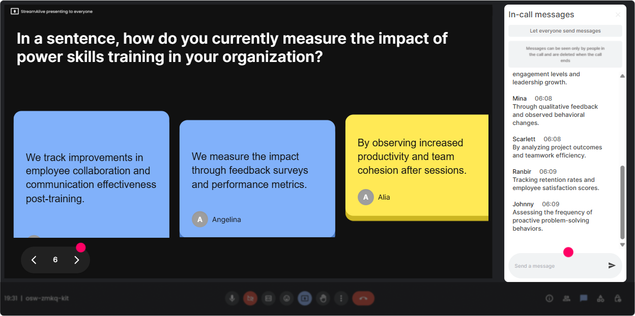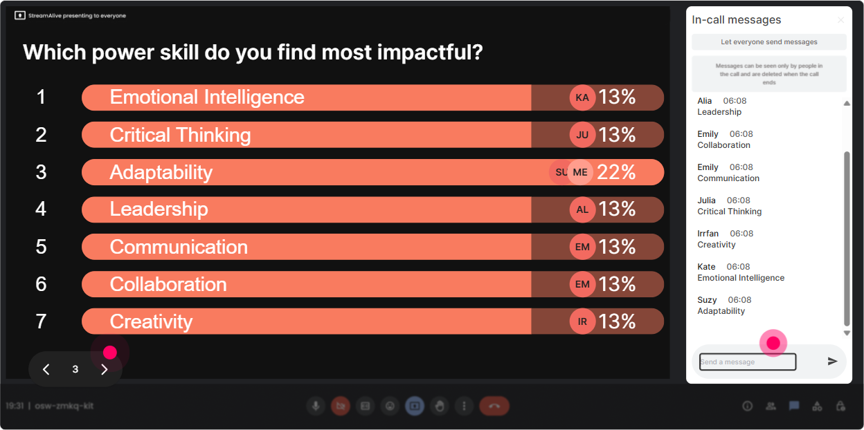 When youre teaching and monitoring chat, its easy to miss great questions (especially in Teams/Zoom with busy threads). StreamAlives Q&A pulls questions out of the chat and displays them neatly so you can actually manage them. How to use it smoothly in this session: - Set the expectation: Drop questions anytime-StreamAlive will catch them and Ill pause every 10 minutes. - Do a parking lot round: Lets do a 3-minute question sweep before we move into practice. - Use it after activities: Ask your hardest how do I handle this? question about power skills facilitation. Trainer tip: This is huge for L&D leaders because their questions are often nuanced. Youll look more organized and responsive instantly.