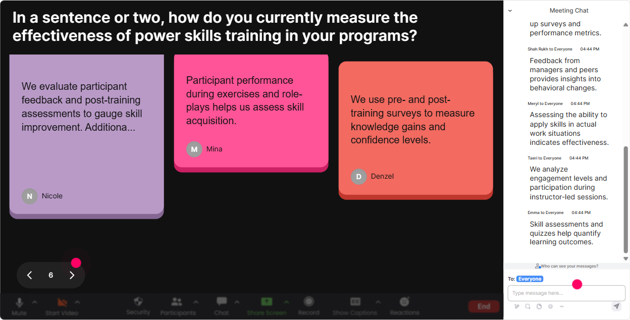 Talking Tiles is perfect when you want longer, real answers-without the chaos of everyone unmuting. Responses drop onto the screen like tiles, so the group sees ideas building in real time. How to use it in Power Skills Focus training: - Make it practical: Whats one moment where power skills made (or broke) a training session for you? - Surface real challenges: Whats your biggest struggle when teaching soft skills to technical teams? - Make it about impact: How does stronger communication show up in your learners day-to-day work? Trainer tip: Use the tiles to spot patterns and say, Im seeing a theme: handling pushback, getting participation, and tough conversations. Lets tackle those first. Now your agenda feels co-created.