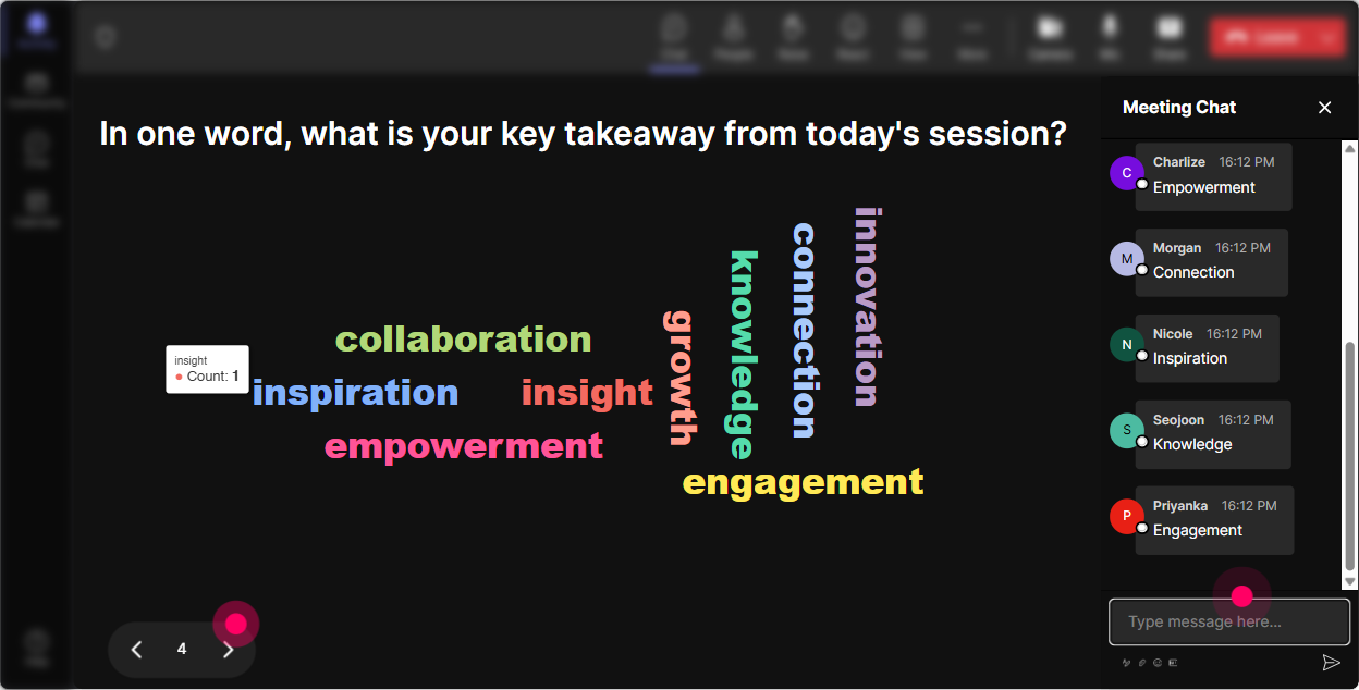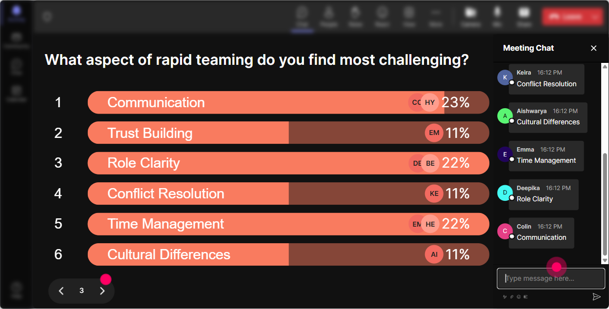 Rapid Teaming becomes real when people connect it to their work-projects, stakeholders, cross-functional chaos, all of it. Use **Talking Tiles** when you want longer, more detailed responses. Their messages drop onto the screen like tiles, which is way more fun than reading a wall of chat. Try prompts like: - Think of a time you had to team fast-what made it work (or fail)? - Whats one thing that slows down alignment in your organization? - If you could fix ONE thing about handoffs between teams, what would it be? Trainer tip: Pick 23 tiles and say, Lets Rapid Team this situation. Then run a mini activity: goal clarity roles communication rhythm first 30-minute plan.
