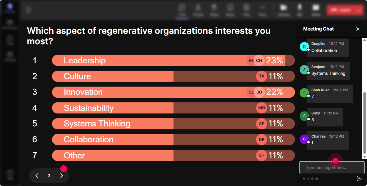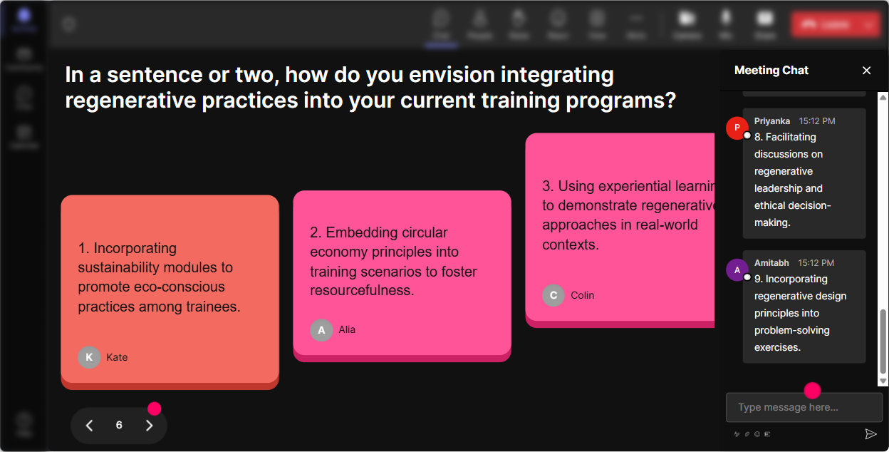 When you want more than a one-word answer-like stories, examples, or ideas-Talking Tiles is your best friend. Responses fall onto the screen like tiles, so the chat becomes a living wall of insights instead of a scroll nobody reads. Great prompts for Regenerative Organizations instructor-led training: - Whats one part of your job where regenerative thinking could change decisions? - Share one training topic you already teach that could be upgraded with a regenerative lens. - Describe a company behavior youd like to see less of-and the regenerative alternative. Trainer tip: After tiles stack up, pick 23 to read out and connect to your content. People LOVE hearing their words echoed back, and it nudges others to participate too.