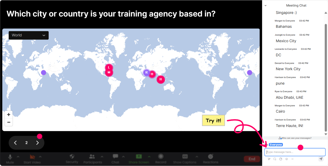 Regenerative Organizations is all about systems, communities, and local context-so a map opener fits perfectly. How to use it in your session: - Kick-off question (classic, always works): Where are you joining from today? - Then tie it to the content: Pick a place youve worked with (or served) where regeneration would matter most-what city/region is it? - Or make it future-focused: If your organization could regenerate one community on earth, where would you start? Why it boosts engagement: everyone has a location, the map fills up fast, and you instantly get a sense of the real-world contexts people are coming from. Bonus: if youre training multiple client teams, youll literally see clusters and can call them out (e.g., Wow, big group from Manila-tell me what challenges youre seeing there).