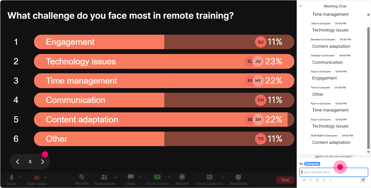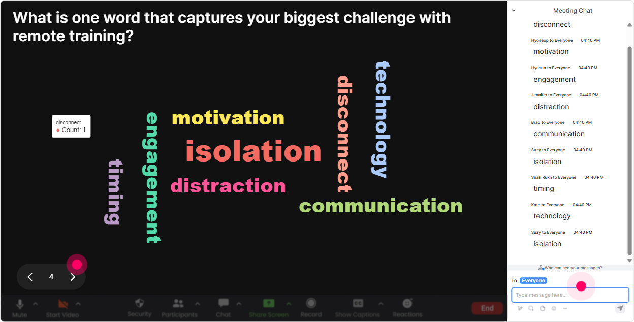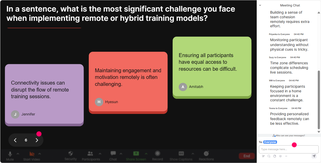 Talking Tiles is great when you want fuller responses-mini-stories, examples, lessons learned. People type in chat, and their messages show up as dynamic tiles on screen, so it feels like a real group conversation. Prompts that work really well for Remote & Hybrid Workplace Models: - Whats one thing that got harder when your team went hybrid? - Share one unwritten rule of hybrid work in your organization. - Whats a mistake leaders make when managing remote teams? - If you were advising a client, whats the first policy youd clarify? Trainer move: pick 23 tiles and read them out like youre hosting a panel. This one says meeting overload-yep. Lets unpack that. Whats causing it? People stay engaged because their words are literally driving the session.