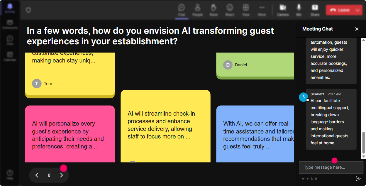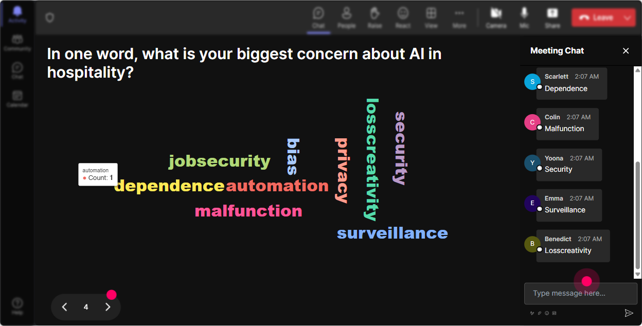 Ask people what impact Responsible AI has on their job role. Use Talking Tiles to let participants share their thoughts, as it turns those into an animated cascade. This will visually reveal how AI might change their daily hospitality operations.