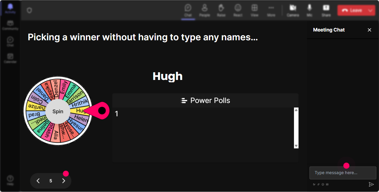 Break up the monotony by asking for a volunteer to unmute and answer your question, but let fate decide who gets to speak with the Spinner Wheel. It adds a dash of fun randomness into your learning environment!