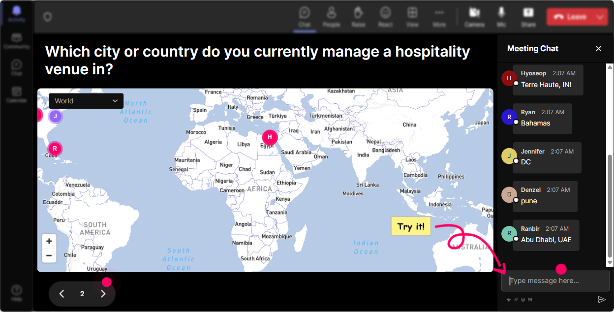 Break the ice with a geographical twist! Ask your attendees to share where they're from using StreamAlive's Magic Maps. This makes everyone feel heard from the get-go and sparks curiosity about the global representation in the session. Try questions like, "Where in the world are you dreaming of visiting after this session?".