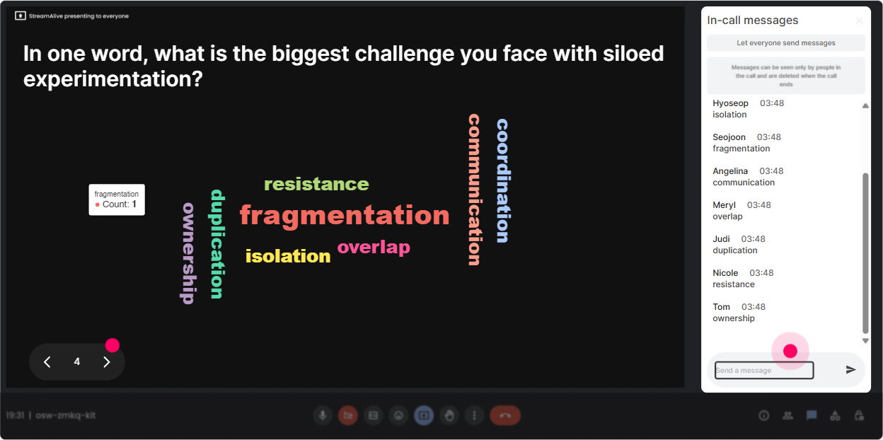 After your session, StreamAlive Analytics shows you what actually happened-not just how it felt. Heres how L&D Leaders and trainers can use it for Siloed Experimentation sessions: - See minute-by-minute engagement so you know where attention dipped (maybe your governance slide was a snooze) and where it spiked (maybe the case study landed). - Replay chat + interaction results so you can capture real quotes and pain points (perfect for follow-up resources or leadership summaries). - Identify your most engaged participants (your champions)-the people who can help spread a shared experimentation culture after the training. - Share interaction summaries via email/Teams to prove outcomes: Heres what the cohort voted as the #1 blocker and Here are the top words people used to describe silos. Its basically your built-in debrief and improvement plan-so every time you run the training, it gets tighter, more relevant, and more engaging.