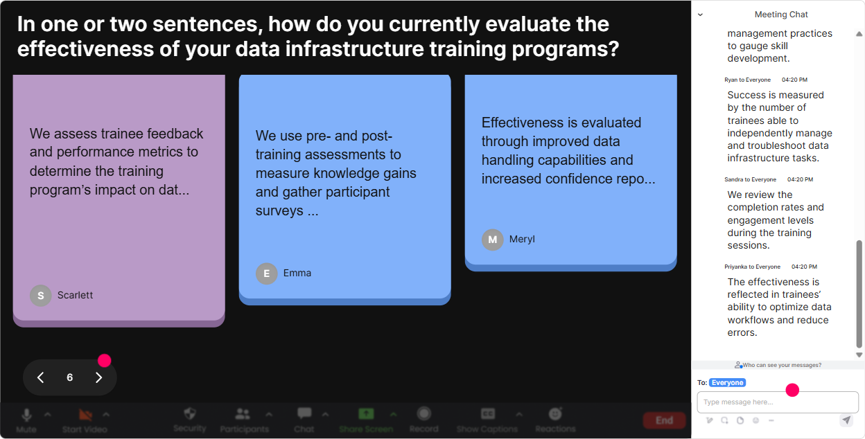 In a topic this technical, questions come fast-and they get buried in chat. StreamAlives Q&A pulls questions out automatically so you can actually manage them like a pro. Ways to use it during Skills Data Infrastructure ILT: - Set a norm: Drop questions anytime-StreamAlive will capture them. Ill pause every 15 minutes to clear the list. - Use it for sticky topics: integrations, data privacy, governance roles, data models, AI skill inference. - End-of-session: Lets do a lightning round-top 5 questions from the Q&A list. Trainer tip: If you see repeated questions, reflect it: Weve got three questions about data ownership-this is a real pain point, so lets spend 5 minutes on a clean RACI model.