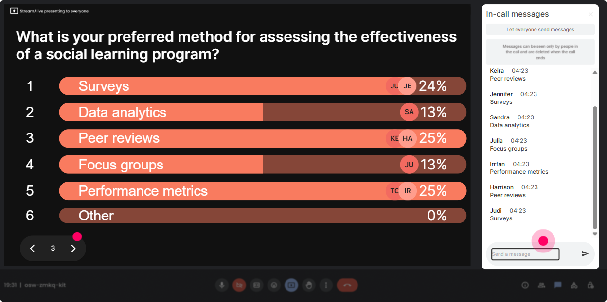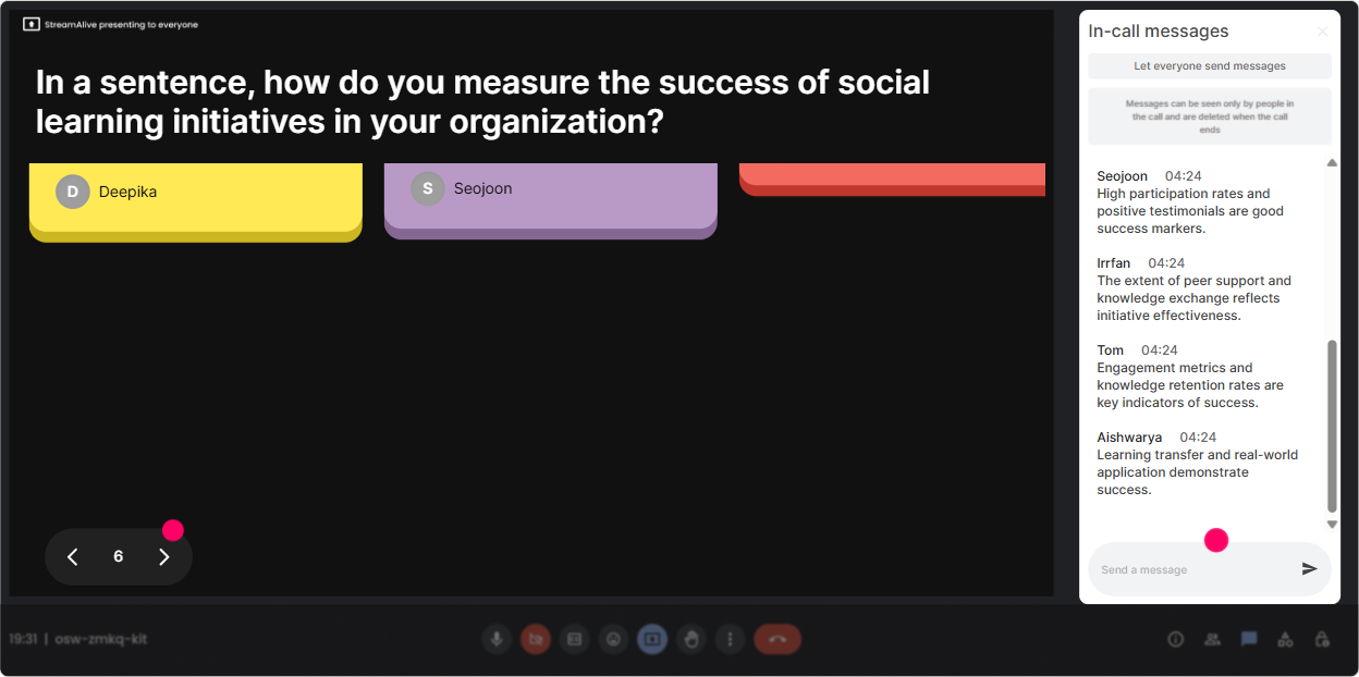 If youve ever missed a great question because chat moved too fast, youll love this. StreamAlive automatically detects and collects questions from the chat so you can handle Q&A like a pro. How to use it during Social Learning ILT: - Set expectations: Ask questions anytime in chat-StreamAlive will catch them for me. - Do structured Q&A moments: Lets pause every 15 minutes and hit top questions. - Use questions as discussion starters: This is a great one-before I answer, who in the group has tackled this? Trainer move: Social Learning isnt just you answering-its the group helping. Q&A becomes a peer coaching segment when you intentionally toss it back to the room.