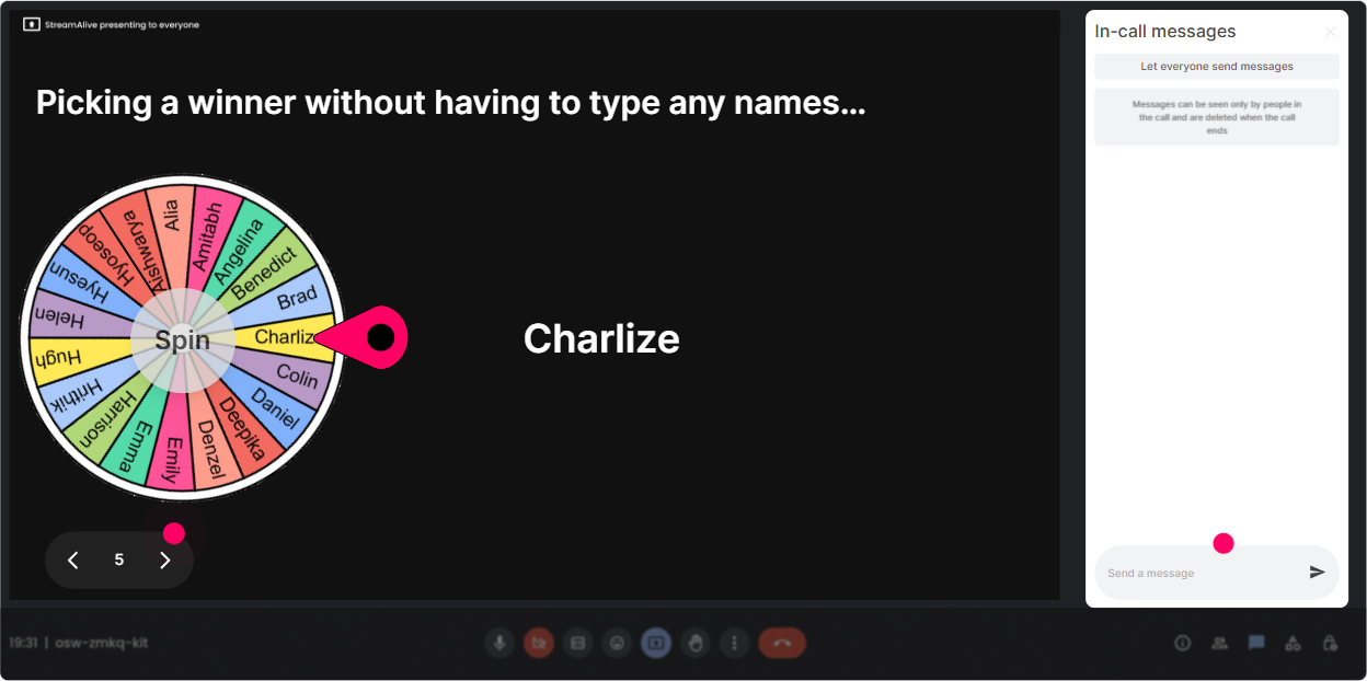 You know that moment when you ask, Who wants to share? and crickets. Spinner Wheel fixes that without putting people on the spot in a weird way. How to use it in a Social Learning-friendly way: - Tell them the rule: Everyone who answers in chat is eligible-so drop something in and you might get picked. - Prompt: Share one Social Learning challenge youre dealing with right now. - Spin: Choose a random contributor and invite them to unmute: Jamie, youre up-tell us more (30 seconds). Trainer move: Make it feel safe: You can pass if you want, but Id love a quick headline. Over time, people realize sharing is normal-and thats the behavior youre trying to build back at work.