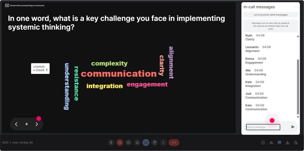 In Systemic Thinking sessions, people ask thoughtful questions-but they get buried fast in chat. StreamAlives Q&A automatically captures them and displays them cleanly so you can actually manage the conversation. How to use it smoothly: - **Set the norm early:** Ask questions anytime-StreamAlive will catch them for me. - **Park questions without ignoring them:** Great question-I'm adding it to our Q&A list and well hit it after this activity. - **End with a strong close:** Pull up the captured questions and do a rapid-fire round. Good prompts to encourage questions: - What part of Systemic Thinking feels fuzzy right now? - Whats one system at work you want help diagnosing?