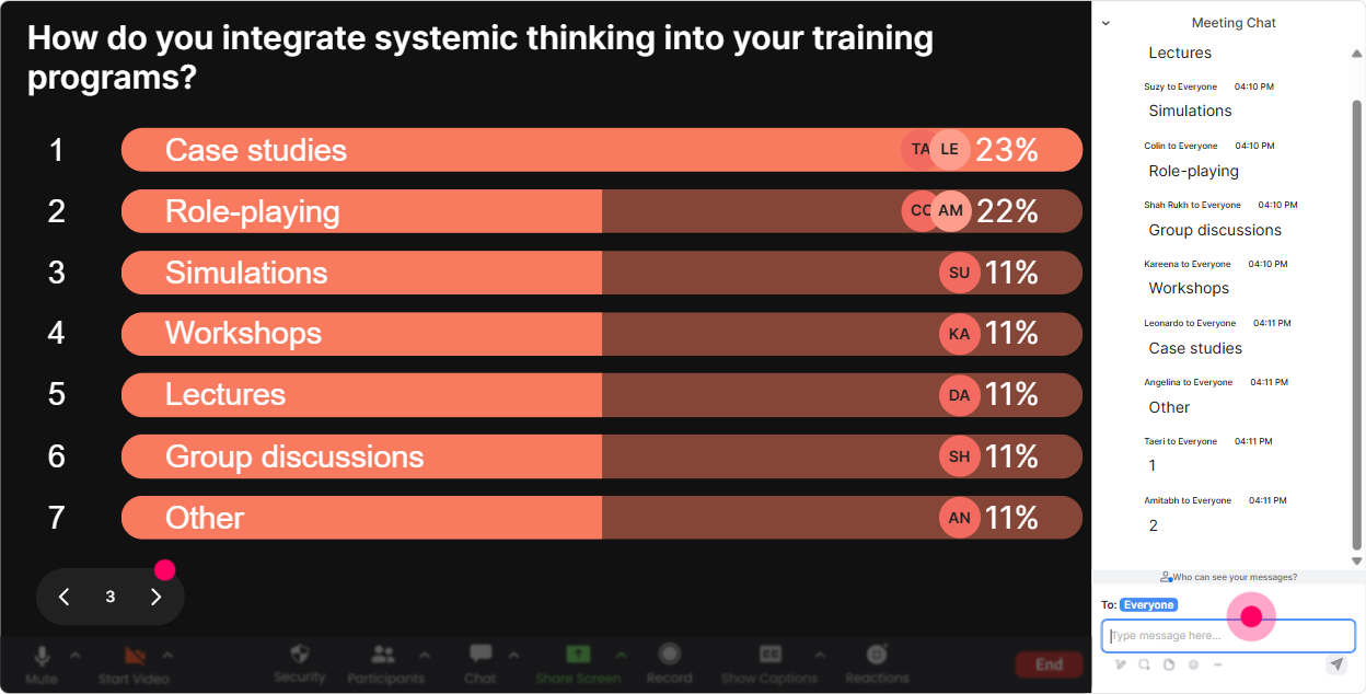Before you dive into loops, leverage points, or root causes, get a real-time pulse check. Rating Polls let you measure confidence (or confusion) without putting anyone on the spot. Use prompts like: - On a scale of 110, how confident are you with Systemic Thinking? - Rate how often your agency currently solves problems by fixing symptoms (1=never, 10=all the time). - How comfortable are you explaining feedback loops to a client? (110) Trainer move: show the live distribution and narrate it like a conversation: Okay, weve got a cluster around 46. Perfect. That tells me well go practical first, jargon later.