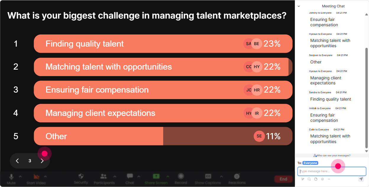Rating Polls are perfect when you want a quick pulse check without a long discussion. People just drop a number in chat, and you instantly see the distribution and average. Use it at the start to shape how you teach: - Rate your current Talent Marketplace knowledge from 1 (brand new) to 10 (I could teach it). - How mature is your internal mobility process today? 1 = chaotic, 10 = well-oiled machine. - How confident are you that managers will support internal moves? 110. Use it mid-session to keep attention: - After explaining matching/AI recommendations: How clear was that? 110. Use it at the end for instant feedback: - How confident are you to explain Talent Marketplace value to a stakeholder now? 110. Trainer tip: When you see a split (some 2s and some 9s), say it out loud. That contrast creates instant relevance: Cool-this means well keep it practical and not assume everyones already bought in.