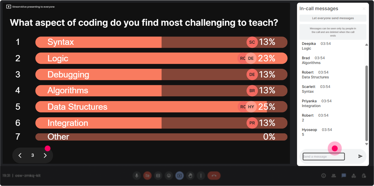 In a fast-moving session, questions get buried in the chat. StreamAlive Q&A pulls them out and displays them clearly so you can actually manage the conversation like a pro. How to use Q&A in this topic: - Park questions during demos: If youve got a question, drop it anytime-StreamAlive will catch it and Ill hit a Q&A pit stop in 5 minutes. - Do a myth-busting segment: Ask your toughest question about Vibe Coding-privacy, accuracy, policies, all fair game. - End with rapid-fire: Lets do 8 minutes of Q&A-top questions on screen, lets go. Trainer tip: This is also a great way to reassure leadership-level attendees: their concerns wont be ignored or lost.