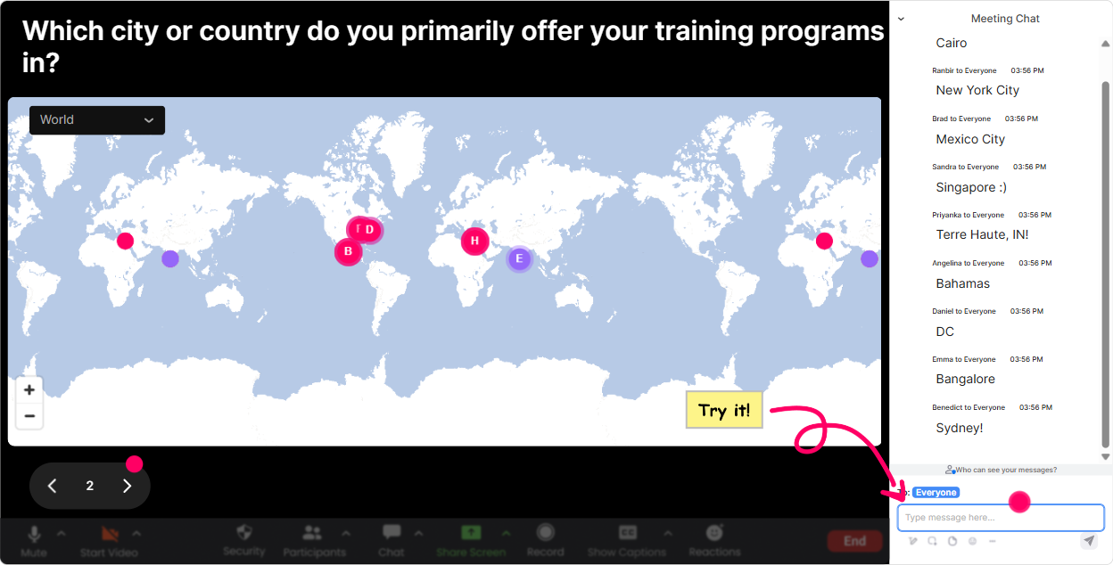 The fastest way to warm up a room is to get everyone typing something easy in chat-and where are you joining from? is the classic for a reason. With Magic Maps, you ask one location-based question, and StreamAlive instantly plots everyones answers on a live world map. It feels like the session starts moving right away. How to use it in Vibe Coding training (Training Agency edition): - Icebreaker that actually ties to the topic: Where are you joining from-and what city has the most creative energy for you? (They enter a city; you get a map full of vibes.) - Set the context for AI + coding across regions: Which country are your learners mostly from? (Great if the agency trains globally.) - Dream client warm-up: If you could run Vibe Coding training for any citys corporate HQ, where would it be? Trainer tip: If you have a huge group, turn on the one location per attendee setting so the map stays clean. And if one region dominates, use cluster colors to highlight it and riff: Looks like weve got a strong Toronto cluster-tell me, what tools are you all using right now?