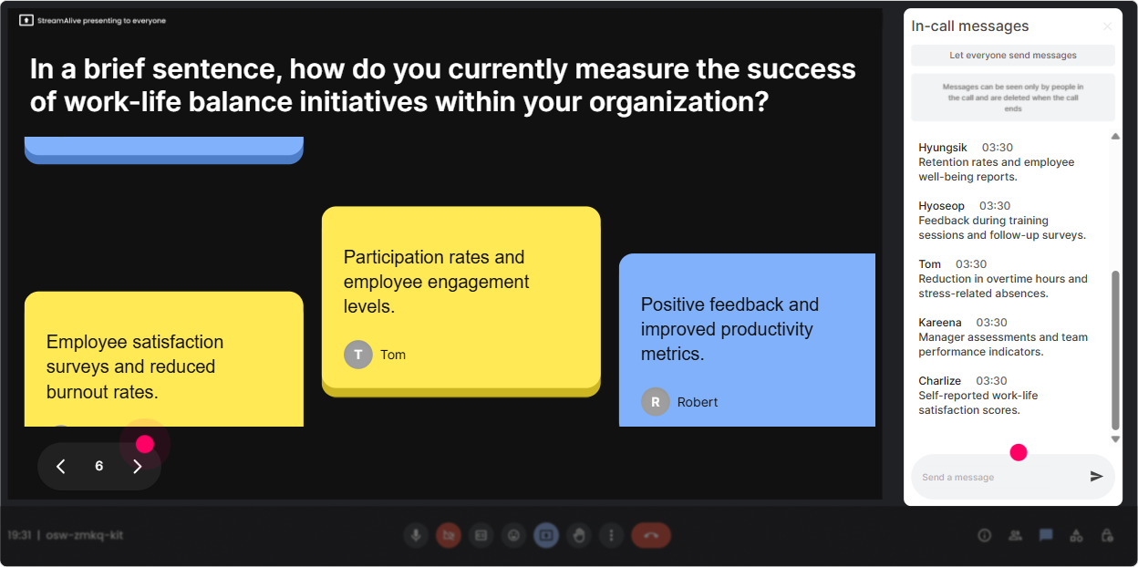 In work-life balance sessions, people often have personal, specific questions-but chat can get messy fast. StreamAlive Q&A pulls questions from chat and organizes them so you dont miss the important ones. **How to frame it for L&D Leaders:** - Drop your questions anytime-StreamAlive will collect them and Ill do a Q&A break every 15 minutes. - End-of-module prompt: Whats one situation youre dealing with right now where boundaries are tough? **Trainer move:** Tag-team the flow: teach collect questions answer the top 3 move on. People feel heard, and you stay in control of time.