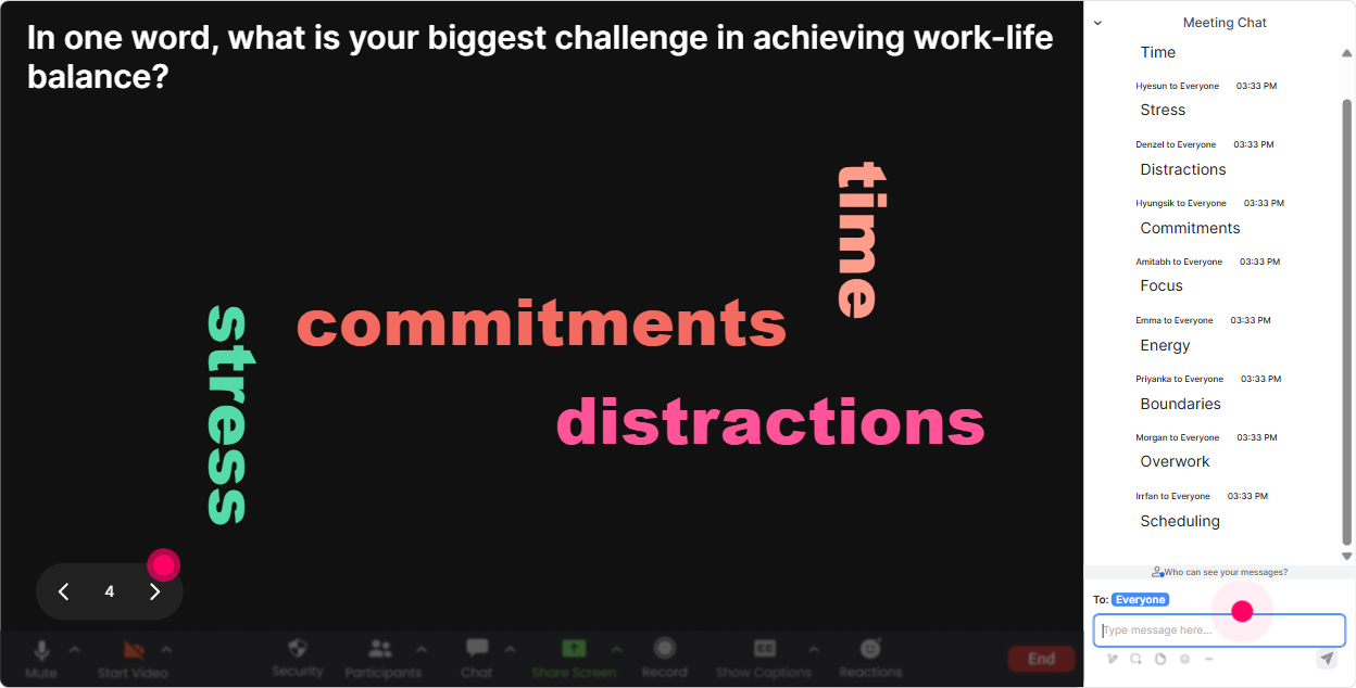 This is where you get honest group insight fast. Ask for 12 words, and StreamAlive turns the chat into a word cloud in real time-so you can literally see what the group is thinking. Great prompts for Work-Life Balance ILT: - In 12 words: what steals your work-life balance most often? (youll get: meetings, email, clients, kids, commute) - When you hear work-life balance whats your first reaction? (excited, skeptical, impossible, needed) - Name one boundary you wish you had. (no-after-hours, lunch-break, focus-time) - What helps you reset after a heavy day? (walk, music, gym, silence) Trainer tip: Pause and read out the biggest words. Then do a quick bridge: Alright-meetings is the monster today. Lets talk about what you can control vs what you cant. It makes your content feel tailored, not generic.