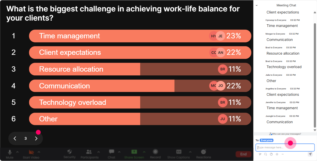 Work-life balance can get personal, so before you dive into frameworks, get a quick temperature check. Rating Polls are perfect because people dont have to overthink-just drop a number in chat and you get a live visual of where the group is at. Use it at multiple moments: - Opener: On a scale of 110, how balanced does your week usually feel? - Before boundaries: Rate your ability to say no at work (1 = impossible, 10 = easy). - Mid-session check-in: Energy right now? 1 = fading, 10 = fully with you. - End of session: How confident are you to try one new habit this week? (110) Trainer tip: When you see the average, react to it out loud like you would in a room: Okay wow, lots of 4s and 5s that tells me this is hitting a real need. That moment alone makes people feel seen.