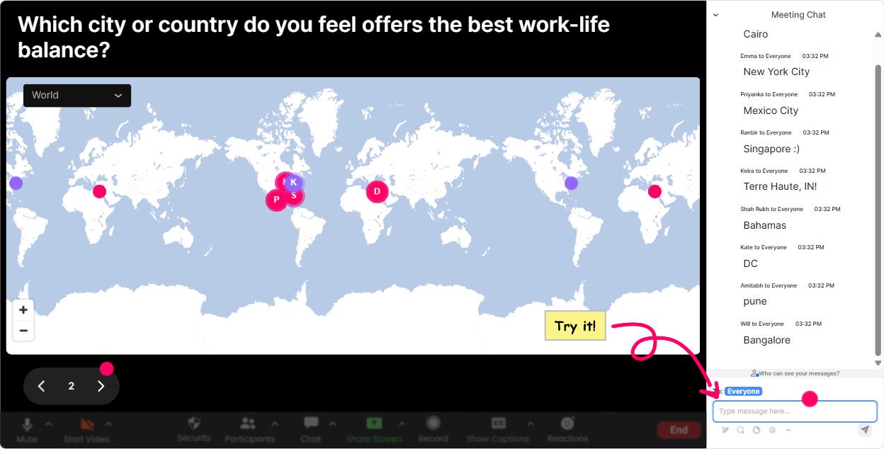 This is the easiest, most natural icebreaker ever-because you were going to ask it anyway: Where are you joining from? With StreamAlives Magic Maps, those locations instantly show up on a live world map, and suddenly your room feels like a community, not a collection of silent squares. Try questions that connect to work-life balance right away: - Where are you joining us from today? (classic, fast warm-up) - If you could log off and teleport anywhere on earth after this session, where would you go? (stress + recovery tie-in) - Name a city that helps you feel calm-where is it? (anchors the theme) - Where were you when you last felt properly rested? (great lead into the cost of burnout) Trainer tip: If youre doing this for a training agency with multiple regions, you can quickly call out clusters (Looks like weve got a big London crew today!). It instantly boosts chat activity and gets people comfortable typing early.