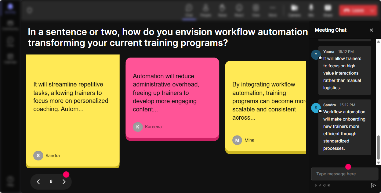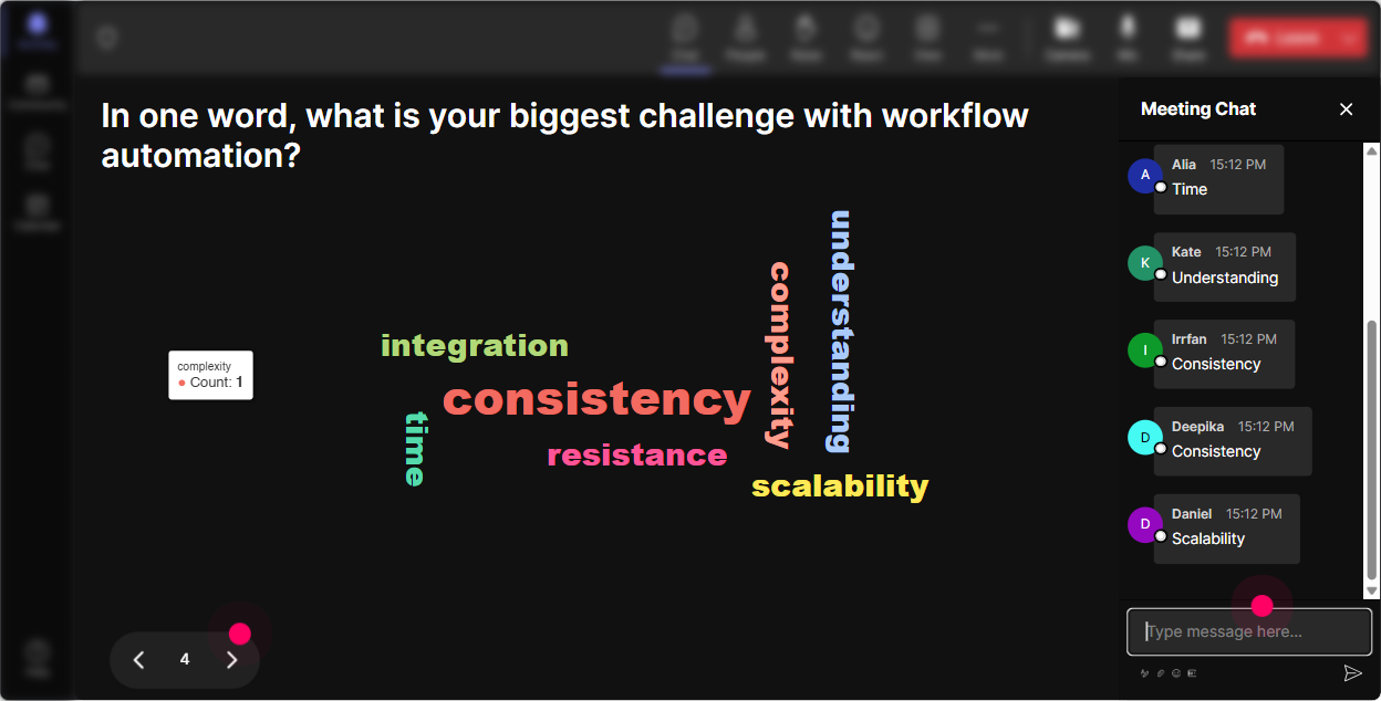 Automation can trigger all kinds of reactions: excited, overwhelmed, skeptical, curious. A Word Cloud is perfect because it gets everyone to answer with just 12 words, and you instantly see whats going on in the room. Great prompts for this topic: - **Before teaching:** Workflow automation in one word: how does it feel? - **Pain-point discovery:** Whats the one word that describes your current admin workload? - **After showing a demo:** One word: what would automating this workflow give you? (Common answers: time, focus, sanity, consistency) Trainer tip: use what shows up big in the cloud to steer the session. If you see overwhelming or confusing, you can say: Perfect-lets simplify this into 3 repeatable steps.