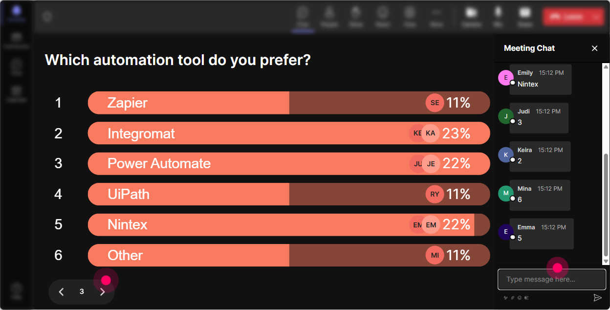 Instead of guessing what your group cares about, run a quick Power Poll and let them choose. When learners feel like they influenced the agenda, engagement jumps because now theyre listening for *their* problem. Poll ideas tailored for corporate trainers: - **What to cover next:** Which workflow should we automate first? 1) Session scheduling + calendar holds 2) Reminder emails + WhatsApp/Teams nudges 3) Attendance + completion tracking 4) Post-session feedback collection 5) Follow-up resources + certificates - **Tool landscape check:** What are you currently using most? (LMS, Teams, Zoom, Google Workspace, Outlook, Forms, Excel, CRM) - **Automation maturity:** Where are you today? 1) All manual 2) Some templates 3) A few automations 4) Mostly automated Trainer tip: show results live and say: Alright, the room voted-feedback automation wins. Lets start there.