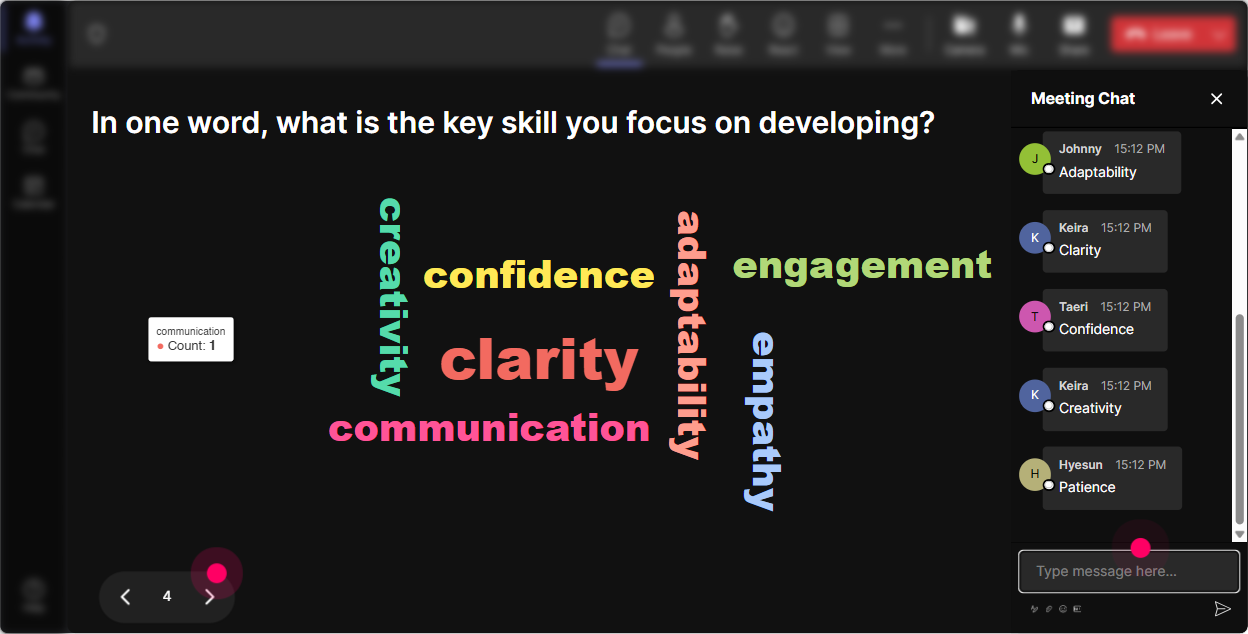 Talking Tiles are great when you want more than one-word answers. Its basically a live brainstorm that feels energetic because responses visually stack on screen. Use it for practical prompts like: - Describe one moment when you saw workplace community improve performance (what happened?) - Whats one small ritual your team could start to build community? - As a trainer, how do you create belonging in the first 5 minutes of a session? - Whats one thing leaders do that accidentally damages community? Trainer tip: Tell participants youre going to steal a few responses to read out loud. Then actually do it-pick 35 tiles and react. People love hearing their idea echoed back, and it encourages others to type too.