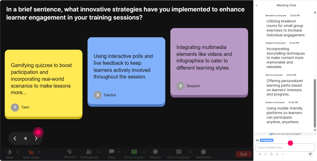 When you want longer answers (not just one word), Talking Tiles makes it fun to share because responses become a live visual-like a moving idea board. Its especially great for Workplace Community because you can collect real examples from different workplaces and training contexts. Prompts that work really well: - Whats one moment where you felt real community at work? - Whats one thing your agency could do to help learners feel more connected during training? - Finish this sentence: Workplace community matters because - Whats one behavior that kills community fast in a workplace? Facilitator move: After the tiles fill up, pick 34 and react to them out loud. It feels like youre co-creating the session with them (because you are).