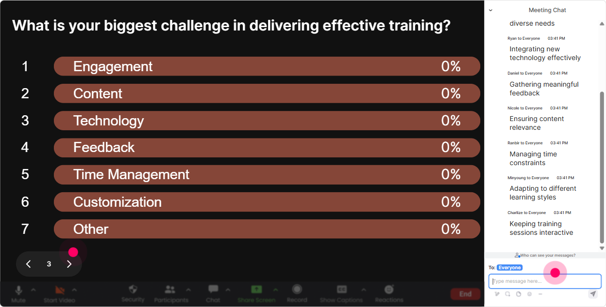 A Quiz interaction is perfect when you want to teach Workplace Community concepts and make sure they landed. Its low effort for participants (they just type an option), and the live results give you a teachable moment. Sample quiz questions you can run: - Which action most directly builds psychological safety? A) Publicly ranking performance B) Encouraging questions and admitting mistakes C) Keeping feedback only for annual reviews D) Avoiding conflict at all costs (Correct: B) - In a learning cohort, whats the strongest early signal of community? A) People multitask less B) People challenge ideas respectfully C) People network outside sessions D) People ask peers for help (You choose the correct based on your model) - Which is a community killer in training? A) Clear group norms B) Peer recognition C) Inside jokes that exclude others D) Structured introductions (Correct: C) Trainer tip: After revealing the correct answer, ask: Drop in chat-what made you pick your option? That turns a quiz into discussion.